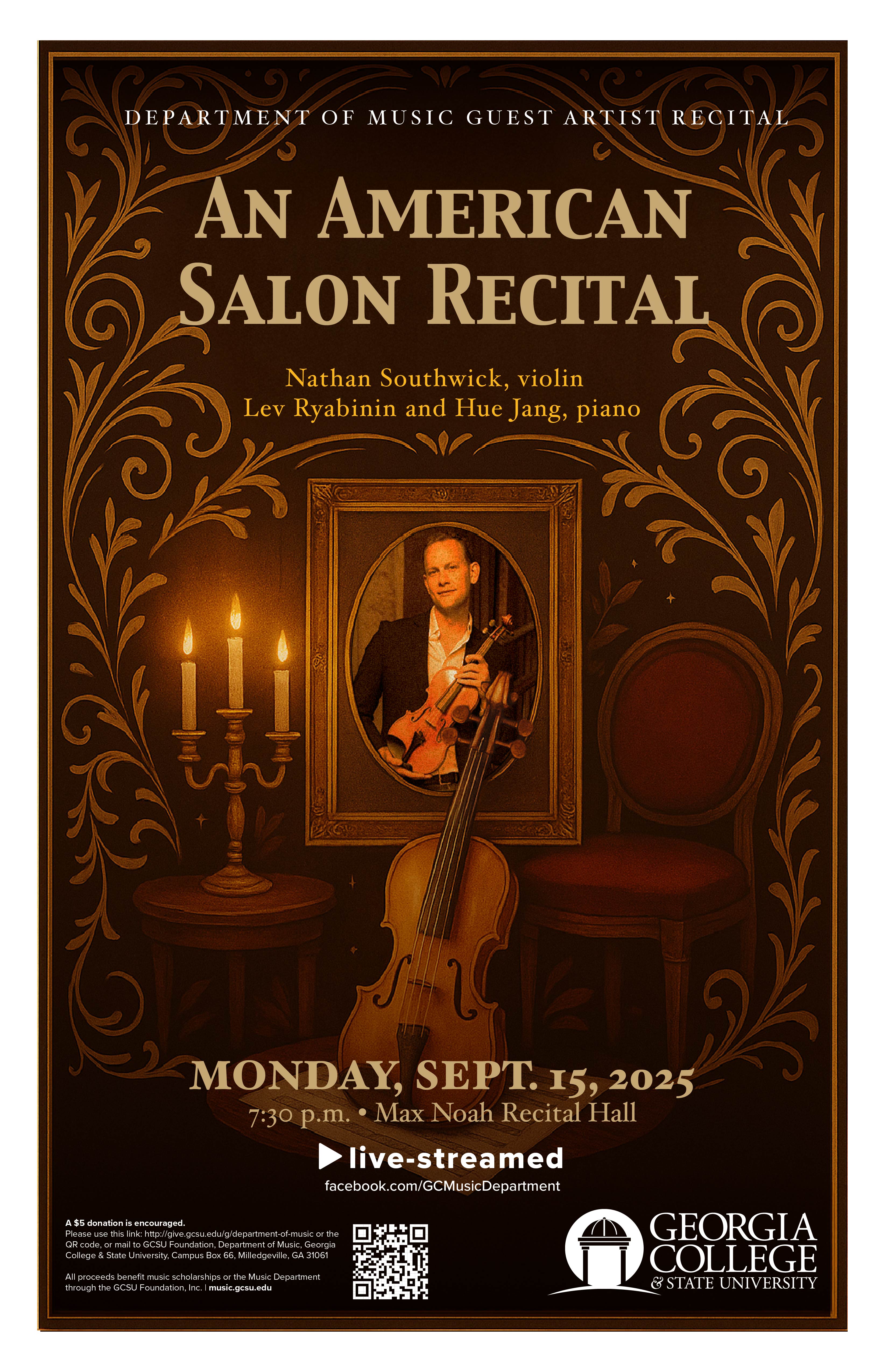 Monday, Sept. 15 A Guest Artist Recital, “An American Salon Recital,” featuring Nathan Southwick, violin, as well as faculty pianists Lev Ryabinin and Hue Jang, will be at 7:30 p.m. in Max Noah Recital Hall at Georgia College & State University. This performance of Romantic 20th century music will feature mostly American short pieces and also the lovely middle violin sonata of Brahms. This concert will also be livestreamed at www.facebook.com/GCMusicDepartment. A $5 donation is encouraged. Online donations can be made at give.gcsu.edu/g/department-of-music/. All proceeds benefit music scholarships or the GCSU Department of Music through GCSU Foundation, Inc. For more information, please email music@gcsu.edu or call 478-445-8289.