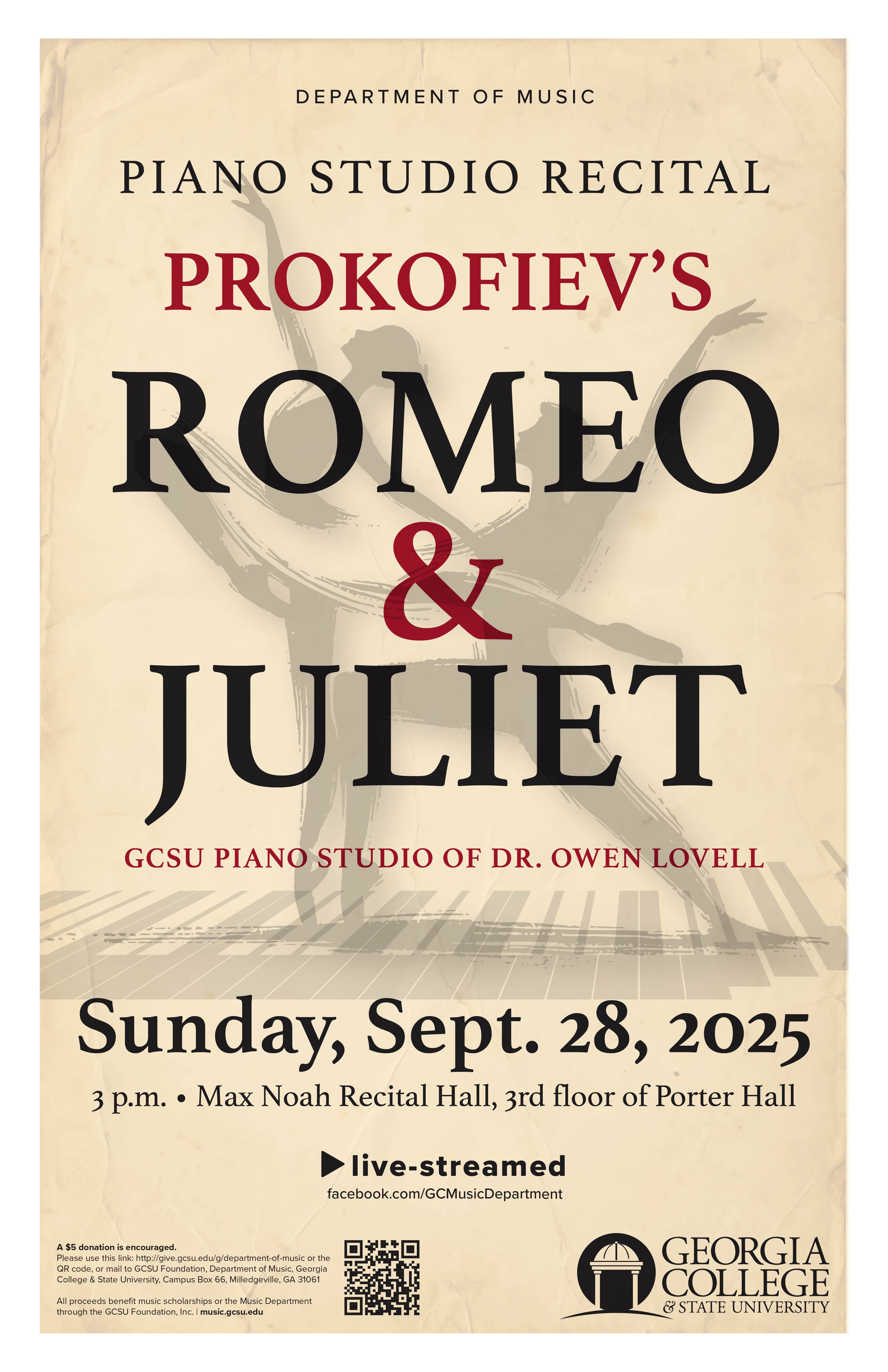 Sunday, Sept. 28 “Prokofiev’s Romeo & Juliet” is the theme of Georgia College & State University’s pian studio recital at 3 p.m. in Max Noah Recital Hall, on the third floor of Porter Hall. Students in Dr. Owen Lovell’s GCSU piano studio will perform several movements from Russian composer Sergei Prokofiev’s piano transcription of the ballet, Romeo and Juliet. Written in the 1930s, these pieces feature stylistic aspects which made the composer famous: playful dances, pounding and relentless rhythms, and romantic moments that evoke moments within original Shakespeare’s original tragic play, as well as its adaptation for orchestra and ballet dancers. This concert will also be livestreamed at www.facebook.com/GCMusicDepartment. A $5 donation is encouraged. Online donations can be made at give.gcsu.edu/g/department-of-music/. All proceeds benefit music scholarships or the GCSU Department of Music through GCSU Foundation, Inc. For more information, please email music@gcsu.edu or call 478-445-8289.