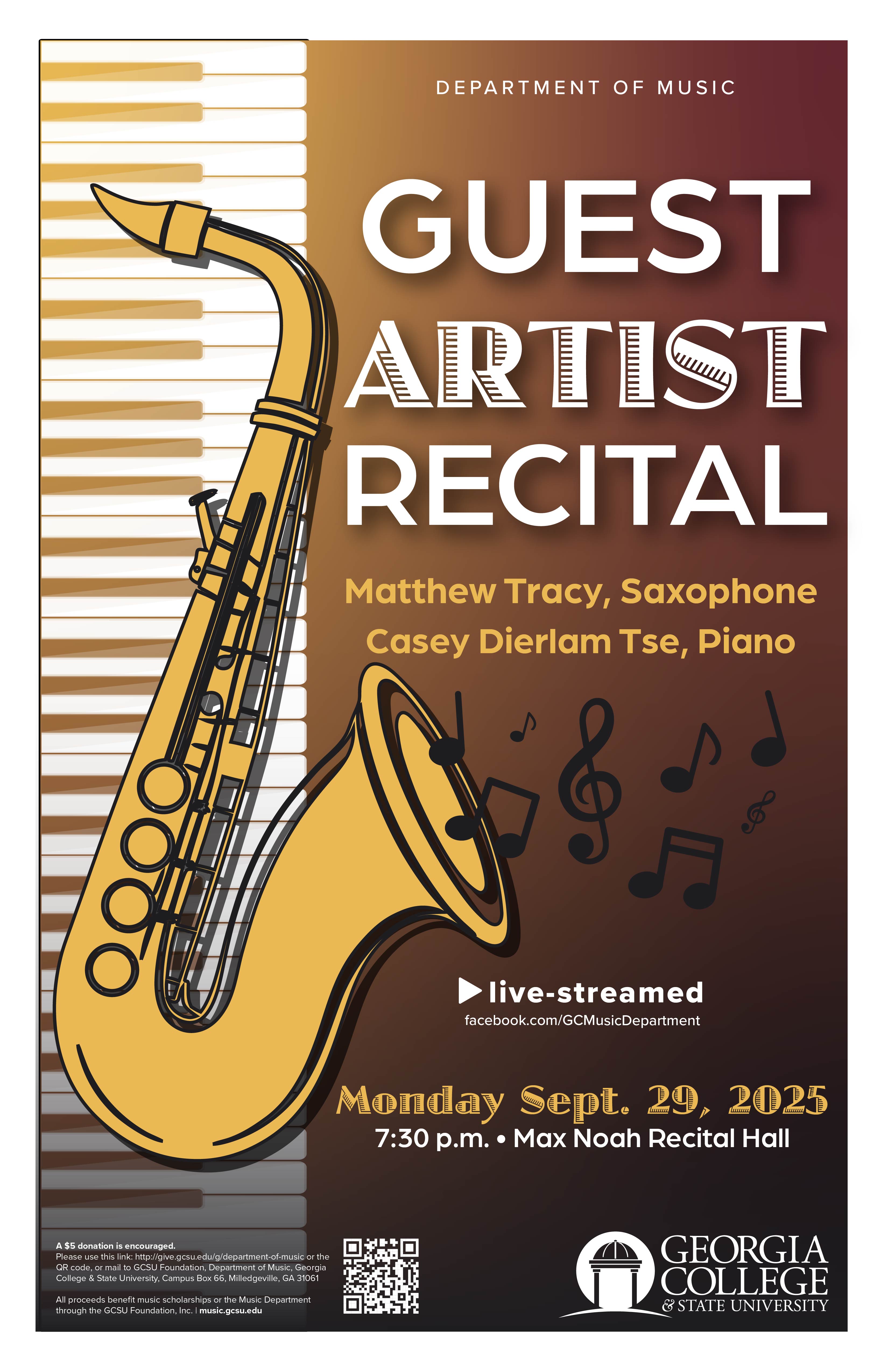 Monday, Sept. 29 A Guest Artist Recital featuring Matthew Tracy, saxophone and Casey Dierlam Tse, piano, will be at 7:30 p.m. in Max Noah Recital Hall at Georgia College & State University. This performance of 20th and 21st century music will feature several composers, including John Williams, Fernande Decruck and several others. This concert will also be livestreamed at www.facebook.com/GCMusicDepartment. A $5 donation is encouraged. Online donations can be made at give.gcsu.edu/g/department-of-music/. All proceeds benefit music scholarships or the GCSU Department of Music through GCSU Foundation, Inc. For more information, please email music@gcsu.edu or call 478-445-8289.