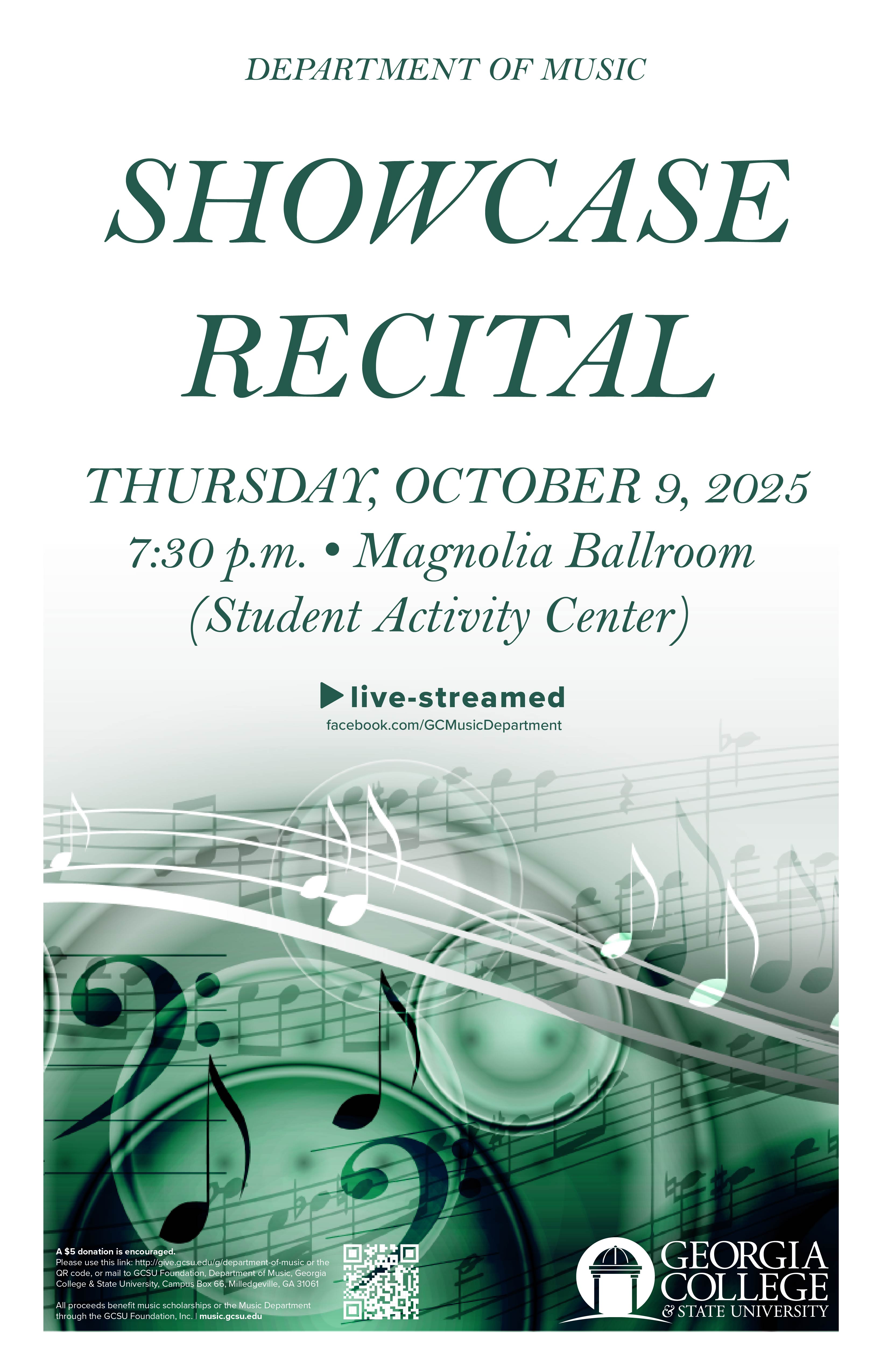 Thursday, Oct. 9 Georgia College & State University presents “Music Department Showcase Recital” at 7:30 p.m. in Magnolia Ballroom at the Student Activities Center. This is a student-focused annual event. It features undergraduate music majors and minors who want to challenge themselves to perform early in their college years. Instrumentalists will perform a variety of music. A reception will follow. A $5 donation is encouraged. All proceeds benefit music scholarships or the GCSU Department of Music through GCSU Foundation, Inc. For more information, please email music@gcsu.edu or call 478-445-8289.