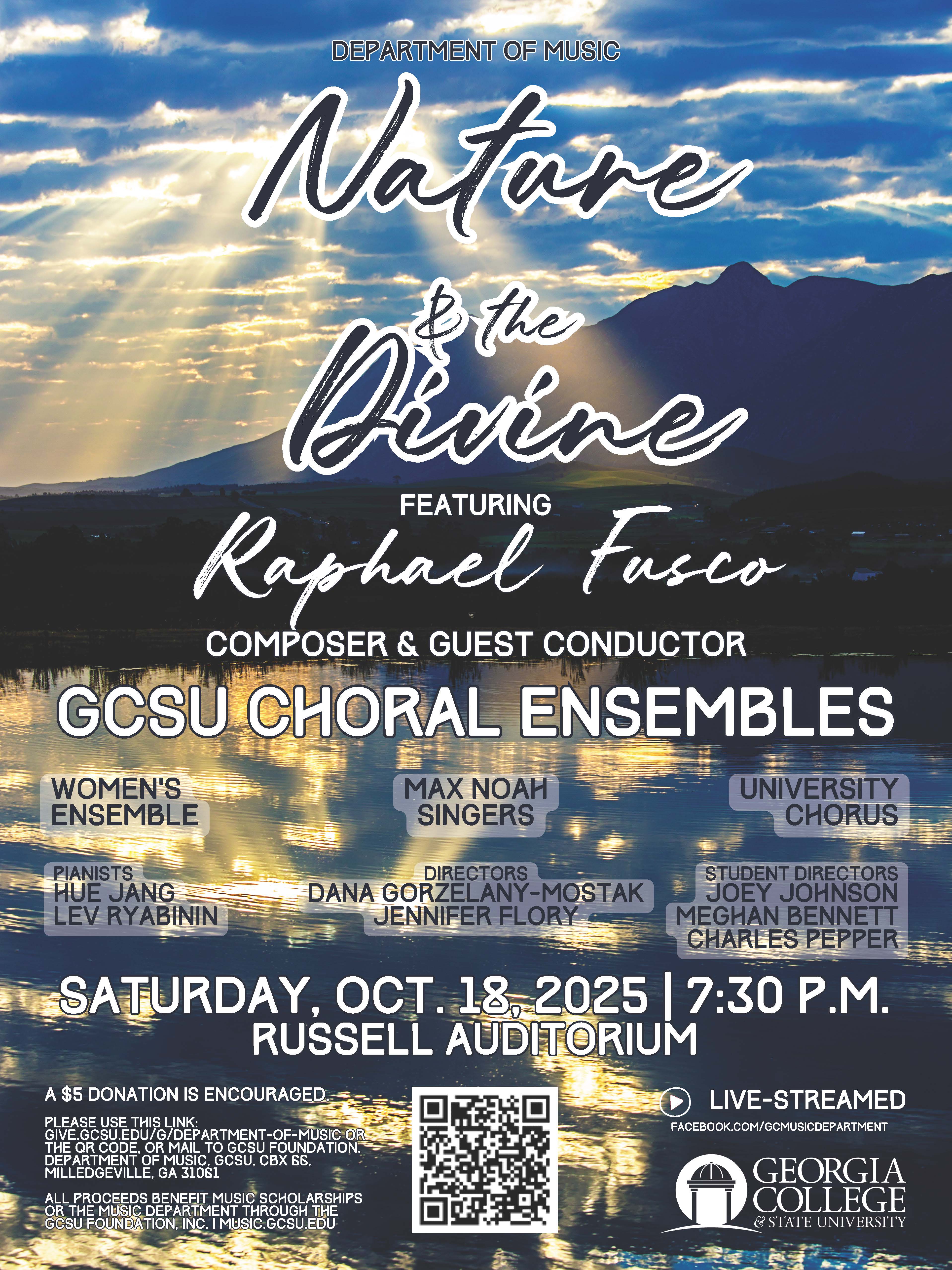 Saturday, October 18 – Georgia College & State University’s Department of Music proudly presents “Nature and the Divine,” an uplifting evening of choral music featuring the university’s three choral ensembles: Women’s Ensemble, Max Noah Singers, and University Chorus. The concert will take place at 7:30 p.m. in Russell Auditorium. The performance will showcase the talents of guest composer and conductor Dr. Raphael Fusco, alongside Dr. Jennifer Flory and Dr. Dana Gorzelany-Mostak. The choirs will be joined by pianists Dr. Hue Jang and Dr. Lev Ryabinin, with guest musicians and student conductors. The concert explores themes of nature and spirituality through varied repertoire by such composers as Fusco, Gustav Holst, and Rosephanye Powell. A suggested donation of $5 is encouraged. Online donations can be made at: give.gcsu.edu/g/department-of-music/ . All proceeds benefit music scholarships and the GC Department of Music through the GCSU Foundation, Inc. For more information, please contact the Department of Music at music@gcsu.edu or 478-445-8289.