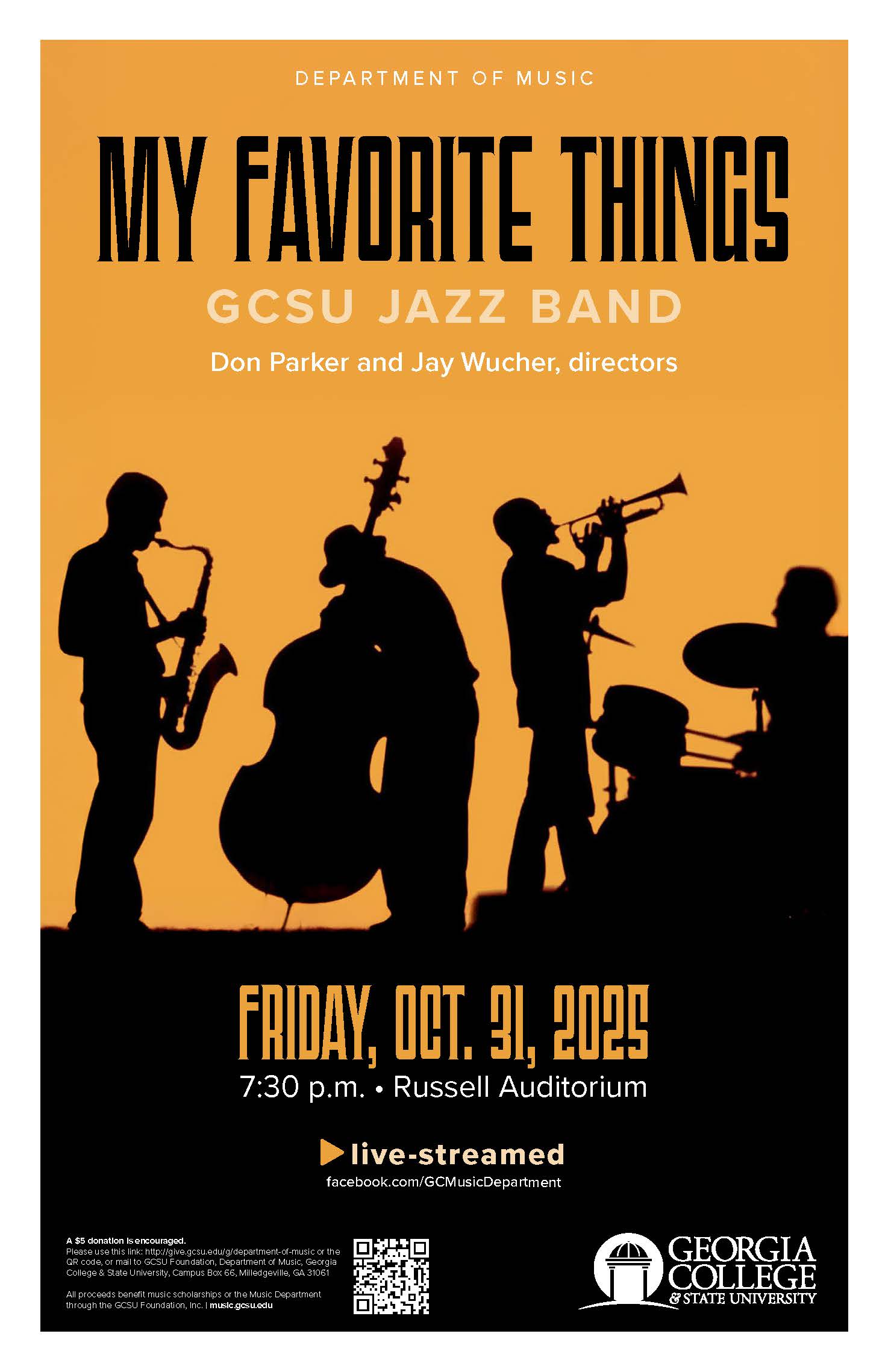 Friday, October 31 Georgia College & State University’s Jazz Band concert will be at 7:30 p.m. in Russell Auditorium. This year’s theme, “My Favorite Things,” is a celebration of the big band sound, featuring tunes that are blues and groove based with a special tribute to Chuck Mangione. This concert will also be livestreamed at www.facebook.com/GCMusicDepartment. A $5 donation is encouraged. Online donations can be made at give.gcsu.edu/g/department-of-music/. All proceeds benefit music scholarships or the GCSU Department of Music through GCSU Foundation, Inc. For more information, please email music@gcsu.edu or call 478-445-8289.