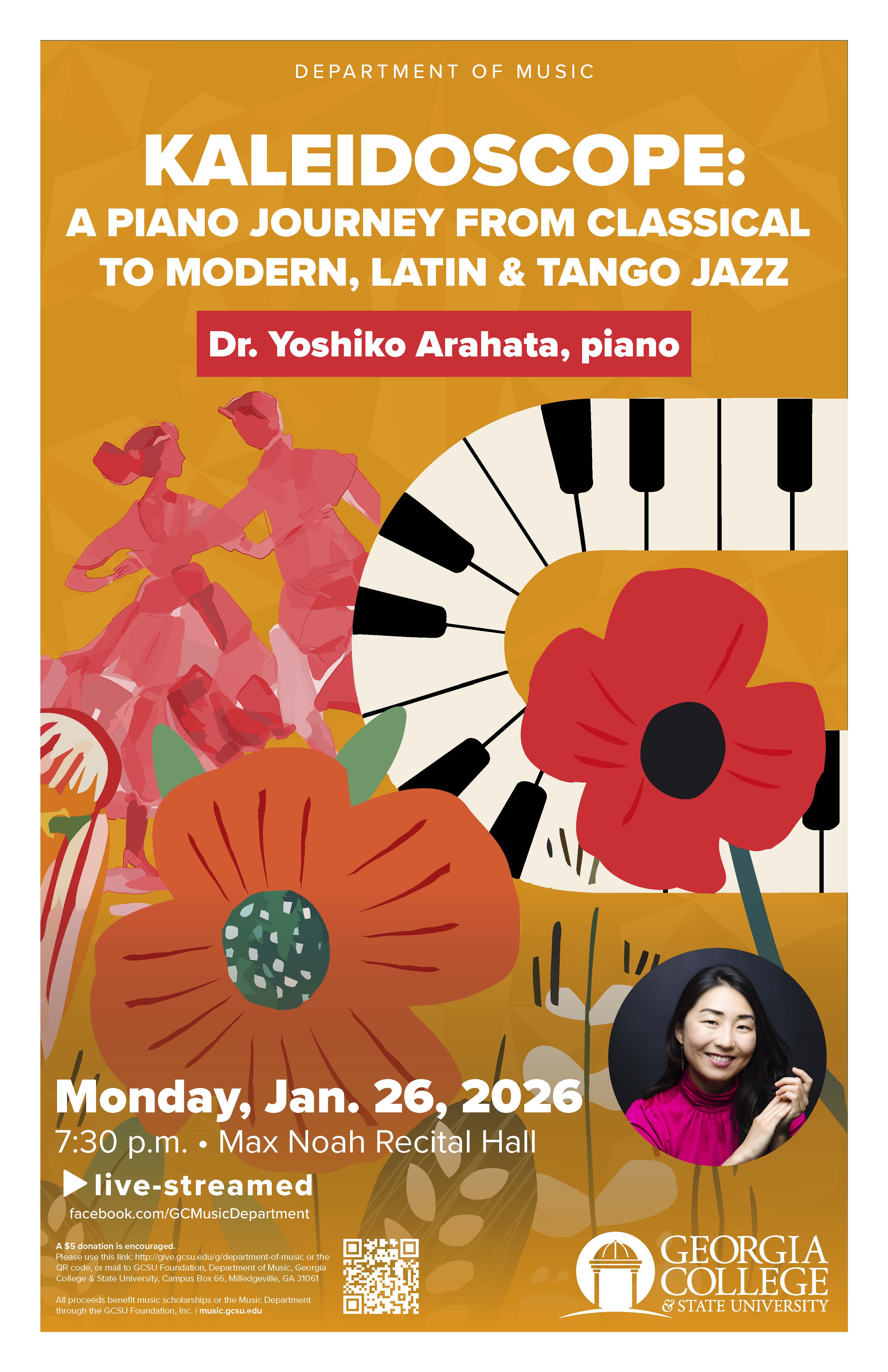 Monday, Jan. 26 A Guest Artist Recital titled, “Kaleidoscope: A Piano Journey from Classical to Modern, Latin & Tango Jazz” will be held at 7:30 p.m. in Max Noah Recital Hall at Georgia College & State University. Featuring pianist Dr. Yoshiko Arahata, the recital includes gems from the classical repertoire by composers such as Joseph Haydn and Alexander Scriabin, alongside the gems from Guatemala, the Dominican Republic, and Argentina. The program also includes vibrant modern, jazz, and tango works by living composers from the United States, Latin America, and Japan, including Henry Martin and Pablo Ziegler. Yoshiko Arahata’s program will include her own composition and improvisation. This concert will also be livestreamed at www.facebook.com/GCMusicDepartment. A $5 donation is encouraged. Online donations can be made at give.gcsu.edu/g/department-of-music/. All proceeds benefit music scholarships or the GCSU Department of Music through GCSU Foundation, Inc. For more information, please email music@gcsu.edu or call 478-445-8289.