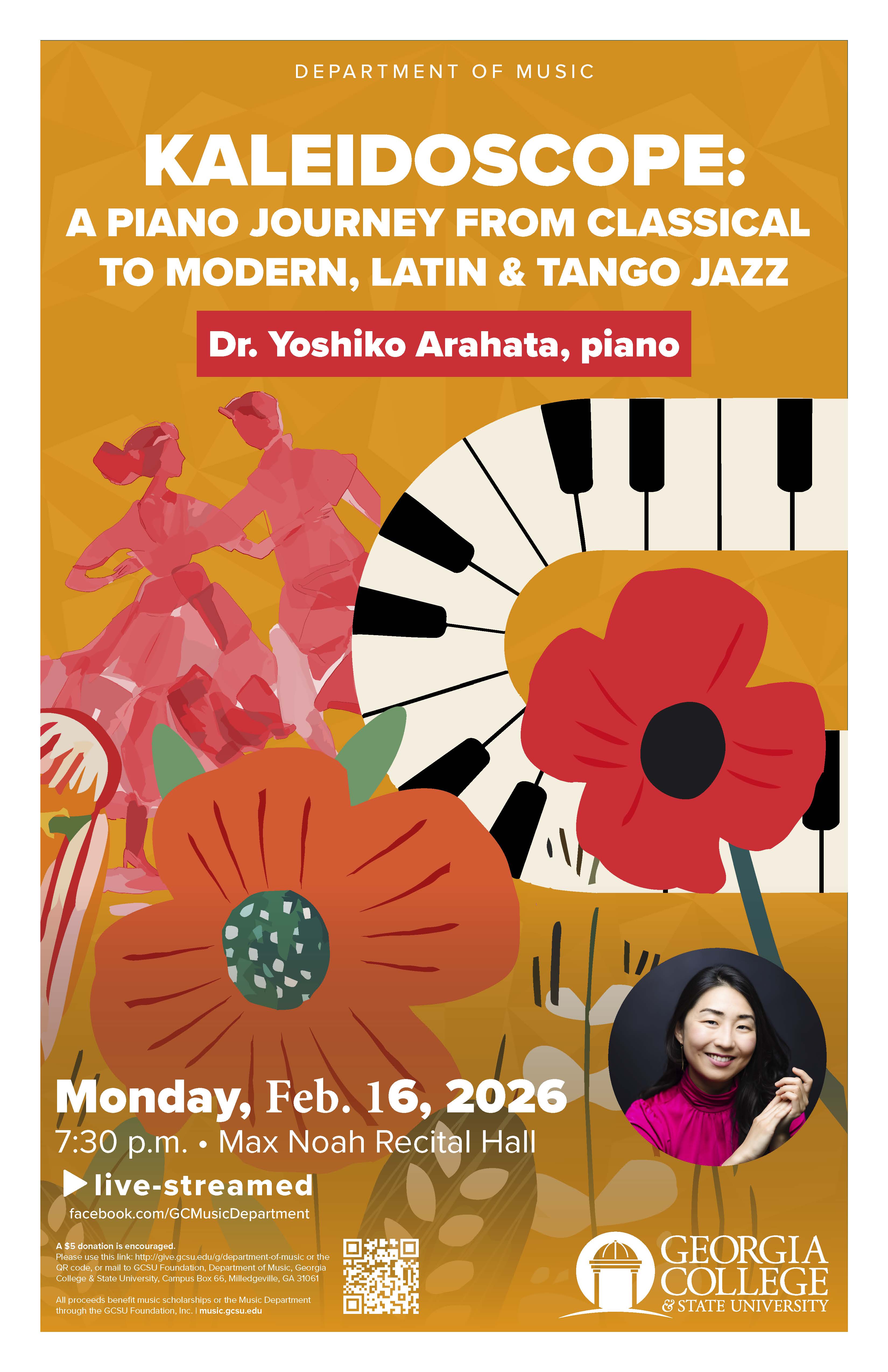 New Date- Feb. 16- A Guest Artist Recital titled, “Kaleidoscope: A Piano Journey from Classical to Modern, Latin & Tango Jazz” will be held at 7:30 p.m. in Max Noah Recital Hall at Georgia College & State University. Featuring pianist Dr. Yoshiko Arahata, the recital includes gems from the classical repertoire by composers such as Joseph Haydn and Alexander Scriabin, alongside the gems from Guatemala, the Dominican Republic, and Argentina. The program also includes vibrant modern, jazz, and tango works by living composers from the United States, Latin America, and Japan, including Henry Martin and Pablo Ziegler. Yoshiko Arahata’s program will include her own composition and improvisation. This concert will also be livestreamed at www.facebook.com/GCMusicDepartment. A $5 donation is encouraged. Online donations can be made at give.gcsu.edu/g/department-of-music/. All proceeds benefit music scholarships or the GCSU Department of Music through GCSU Foundation, Inc. For more information, please email music@gcsu.edu or call 478-445-8289.