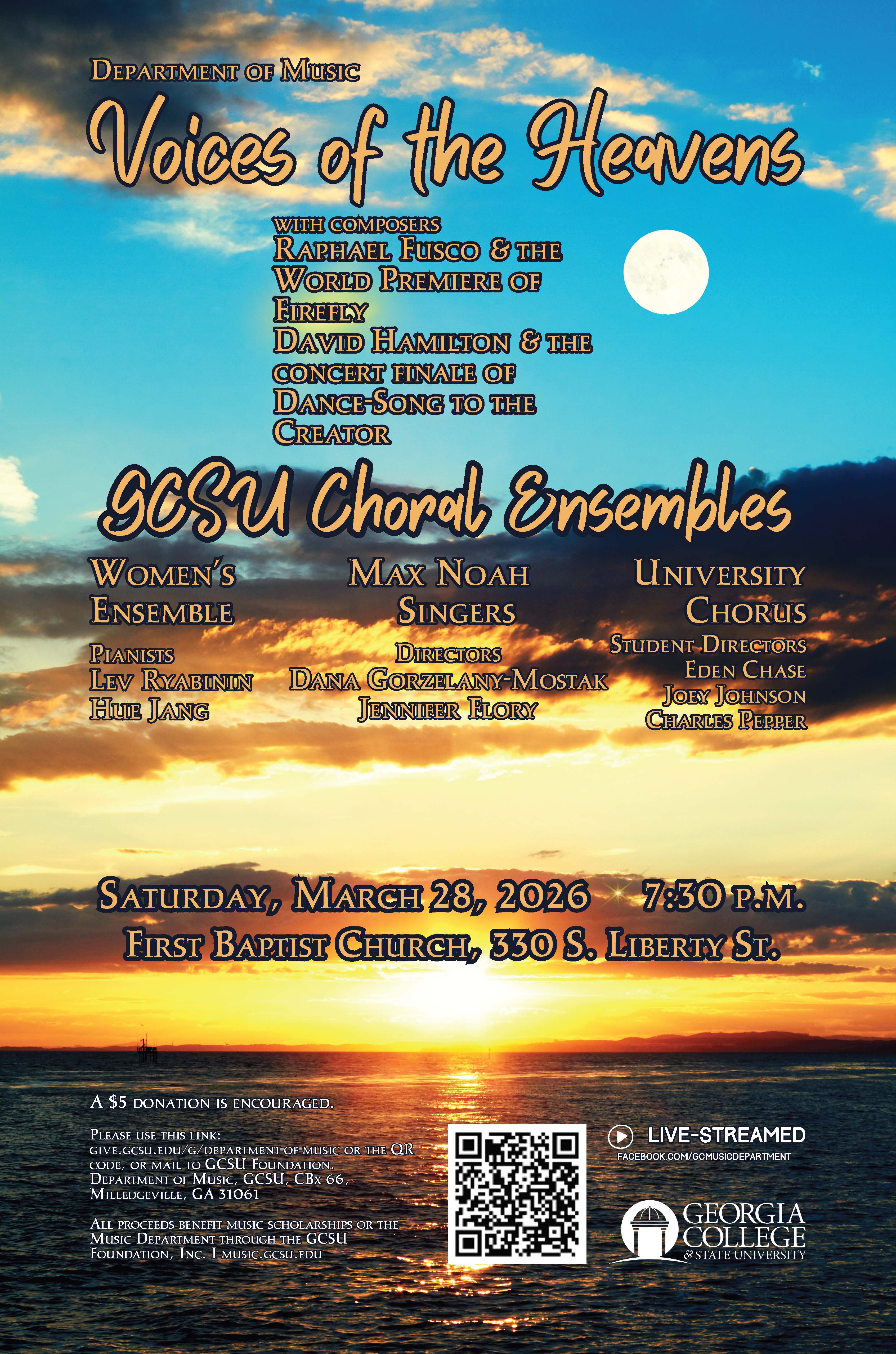 Georgia College & State University’s three choral ensembles—Women’s Ensemble, Max Noah Singers, and University Chorus—present Voices of the Heavens, a celestial‑themed concert at 7:30 p.m. on Saturday, March 28, 2026, at First Baptist Church (330 S. Liberty Street). The program spans music from the mid‑18th century to a world premiere by Raphael Fusco. Composers Raphael Fusco and David Hamilton will be in attendance.