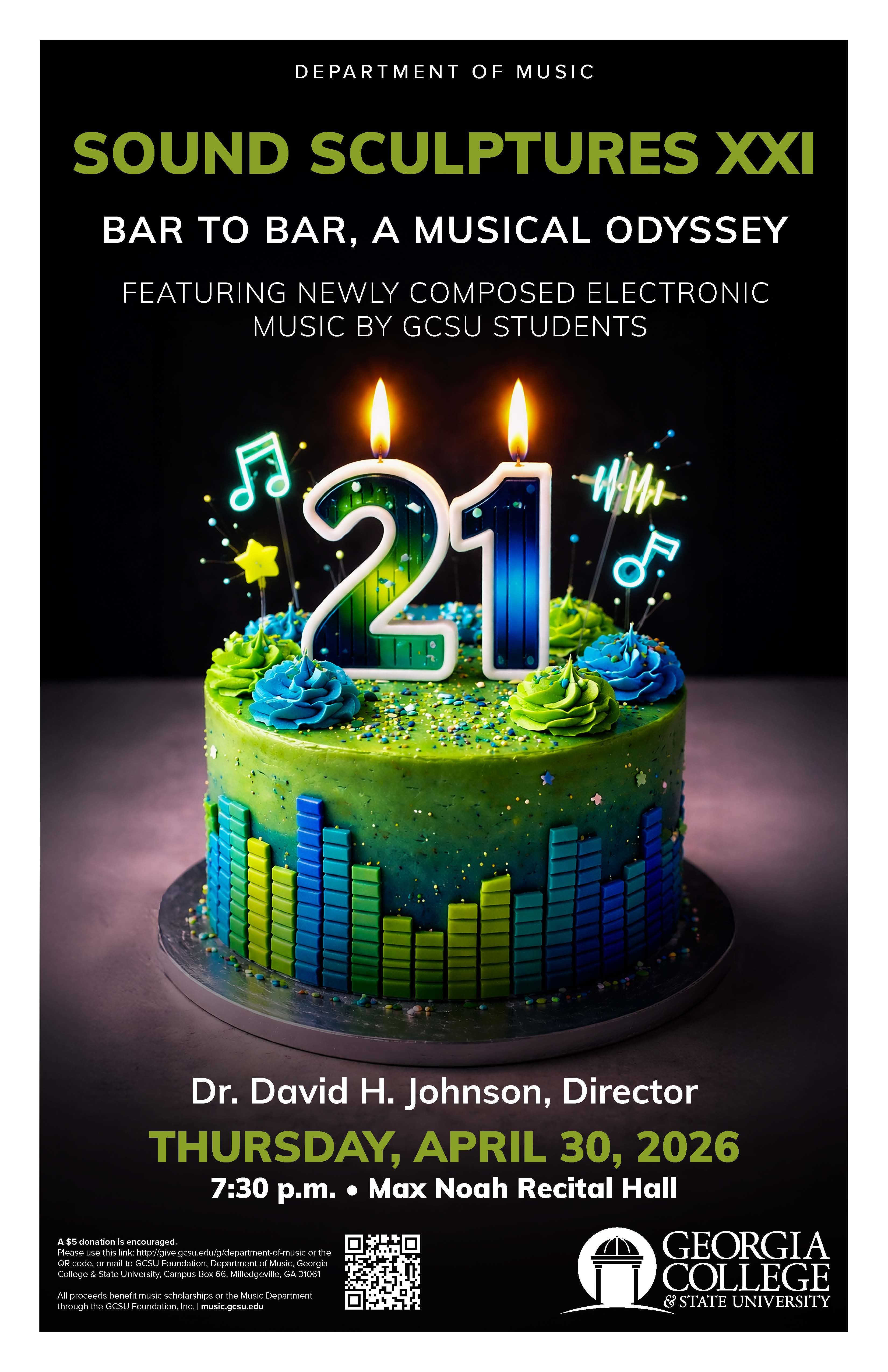 4.30.26 In celebration of the 21st birthday of Sound Sculptures, Georgia College & State University presents Sound Sculptures XXI: Bar to Bar, a Musical Odyssey on Thursday, April 30, at 7:30 p.m. in Max Noah Recital Hall. Directed by Dr. David H. Johnson, this dynamic concert showcases newly composed electronic works by Georgia College students. The program guides the audience on a musical journey from one sonic world to the next in an imaginative listening experience. A $5 donation is encouraged. Contributions may be made online at give.gcsu.edu/g/department-of-music/ All proceeds support music scholarships and the GCSU Department of Music through the GCSU Foundation, Inc. For more information, please email music@gcsu.edu or call 478-445-8289.culptures XXI