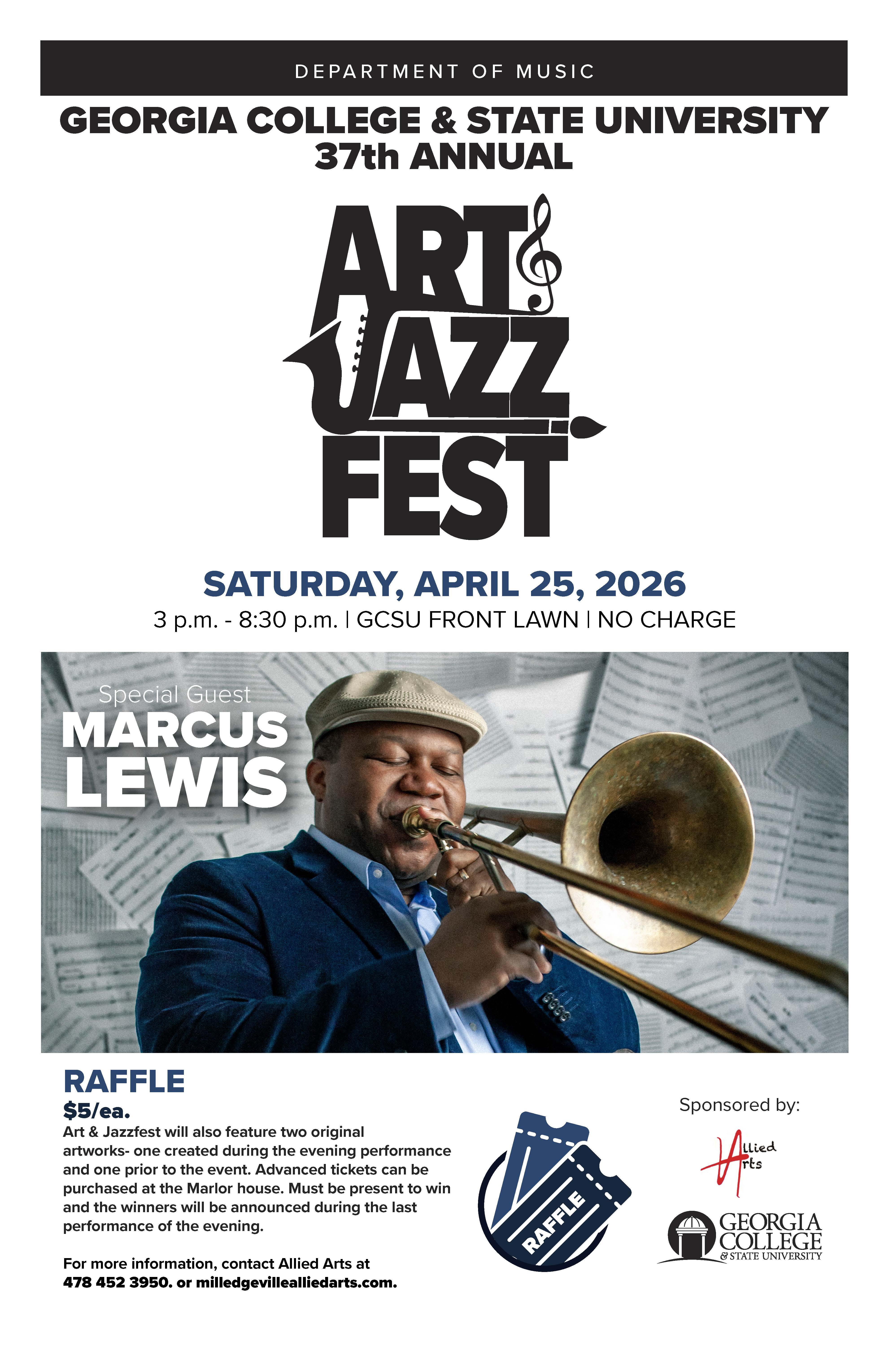 Saturday, April 25 Georgia College & State University’s Music Department and Milledgeville Allied Arts will hold the 37th Annual Art & JazzFest from 3 p.m.to 8:30 p.m. on GCSU Front Campus. The evening features live performances from local middle and high school bands and Georgia College Alumni Band, as well as a performance by the GCSU Jazz Band featuring our special guest artist and trombonist, Marcus Lewis. Art & JazzFest offers local schools an opportunity to showcase their student bands in a 30-minute performance and receive feedback from guest clinicians. This event also provides jazz lovers and community members a relaxing afternoon and evening of local and professional entertainment. Milledgeville Allied Arts will feature and have a Raffle for two original artworks- one created during the evening performance and one prior to the event. Raffle tickets can be purchased in advance at the Marlor House or at the event for $5 each. JazzFest is free. Bring a picnic blanket and lawn chair. For more information, contact the music department at (478) 445-8289 or music@gcsu.edu.