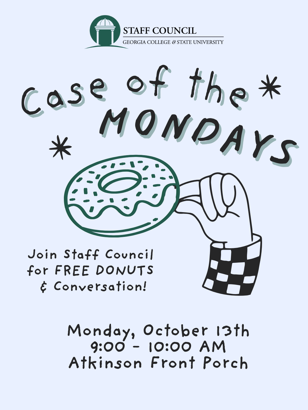 Join your 2025-2026 Staff Council for a Case of the Mondays on Monday, Oct. 13, from 9 until 10 a.m on the Atkinson Hall Front Porch. You can grab a doughnut and make a friend to kick off your work week right!