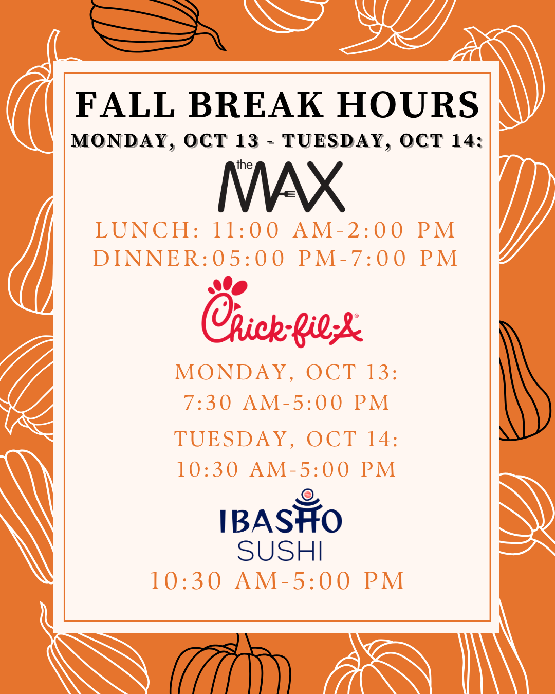 Dining Services will have adjusted hours Oct. 13-14 for fall break: