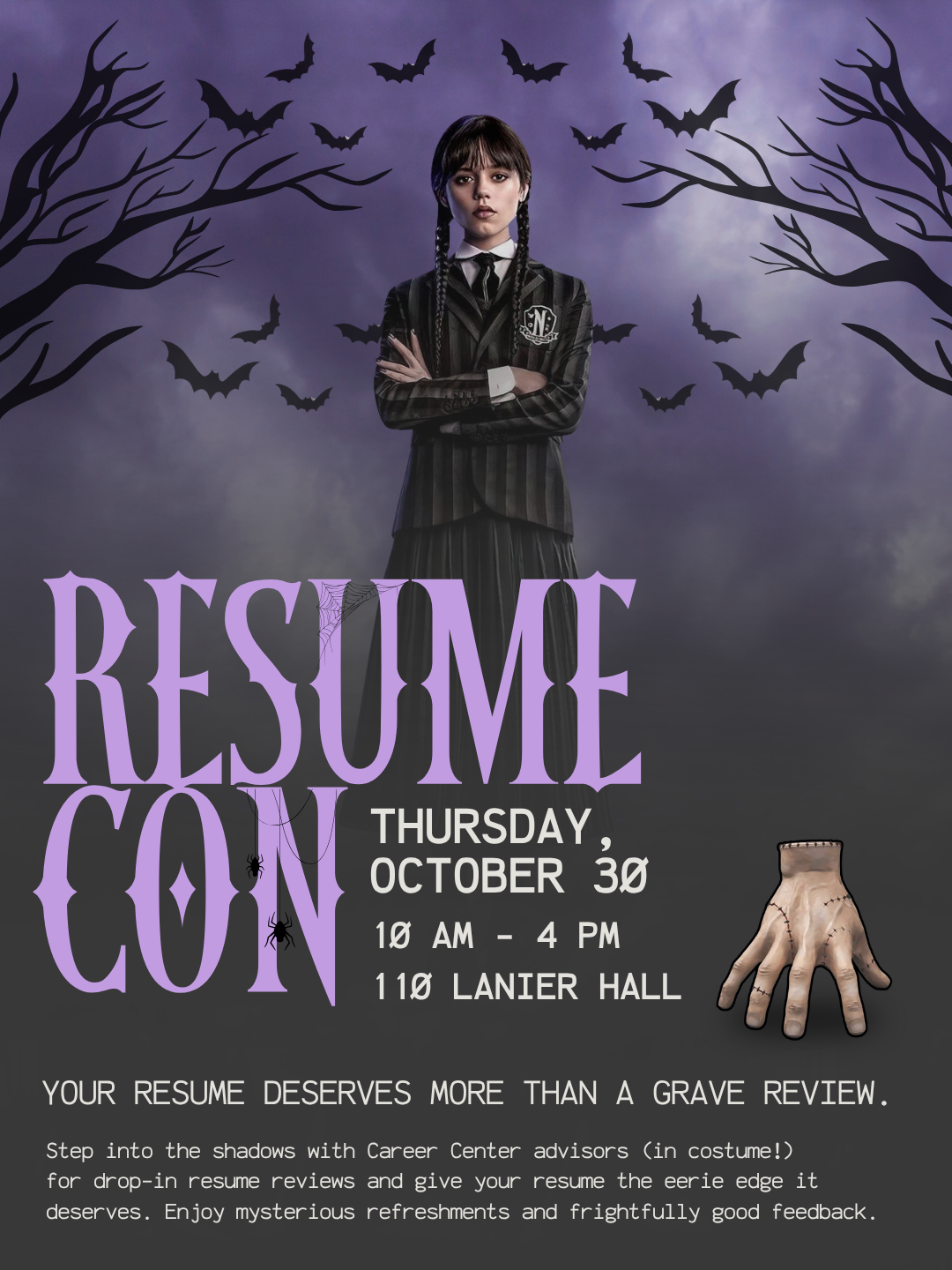 Step into the shadows with Career Center advisors (in costume!) for 15-minute drop-in resume reviews and give your resume the eerie edge it deserves.