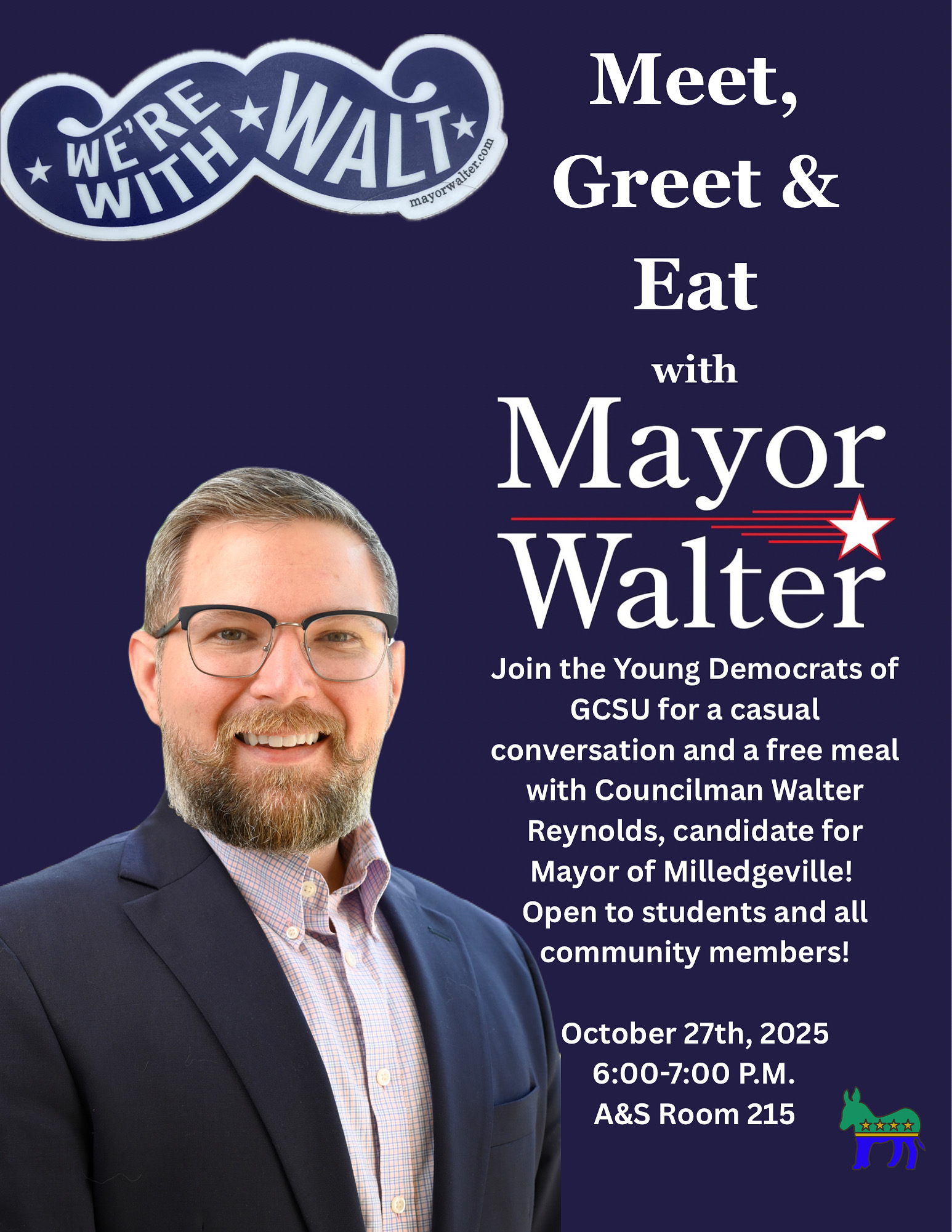 Join the Young Democrats of Georgia College & State University for a casual conversation and free meal with Councilman Walter Reynolds, candidate for Mayor of Milledgeville! This event is open to students and all community members.