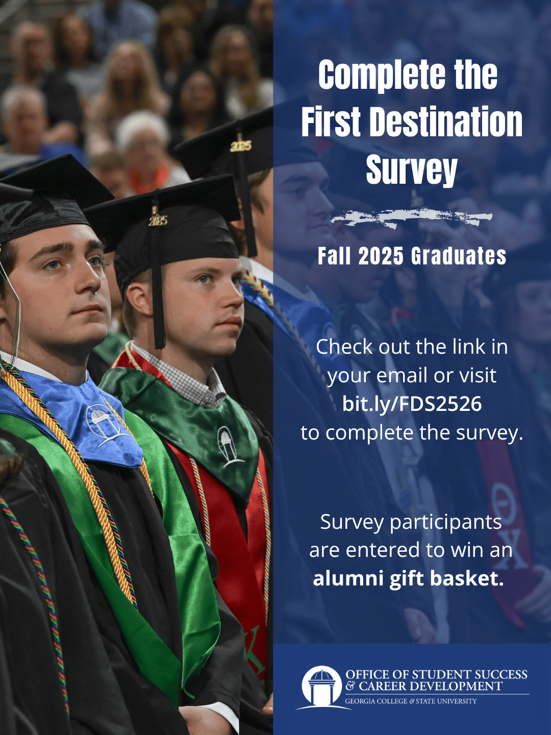 Congratulations on your upcoming graduation! Please take a few minutes to complete your First Destination Survey. We want to hear all about your upcoming career, graduate school, military, travel or service opportunities. If you are still looking for a job or awaiting a decision from a graduate school, please complete the survey and indicate “Still Looking.”