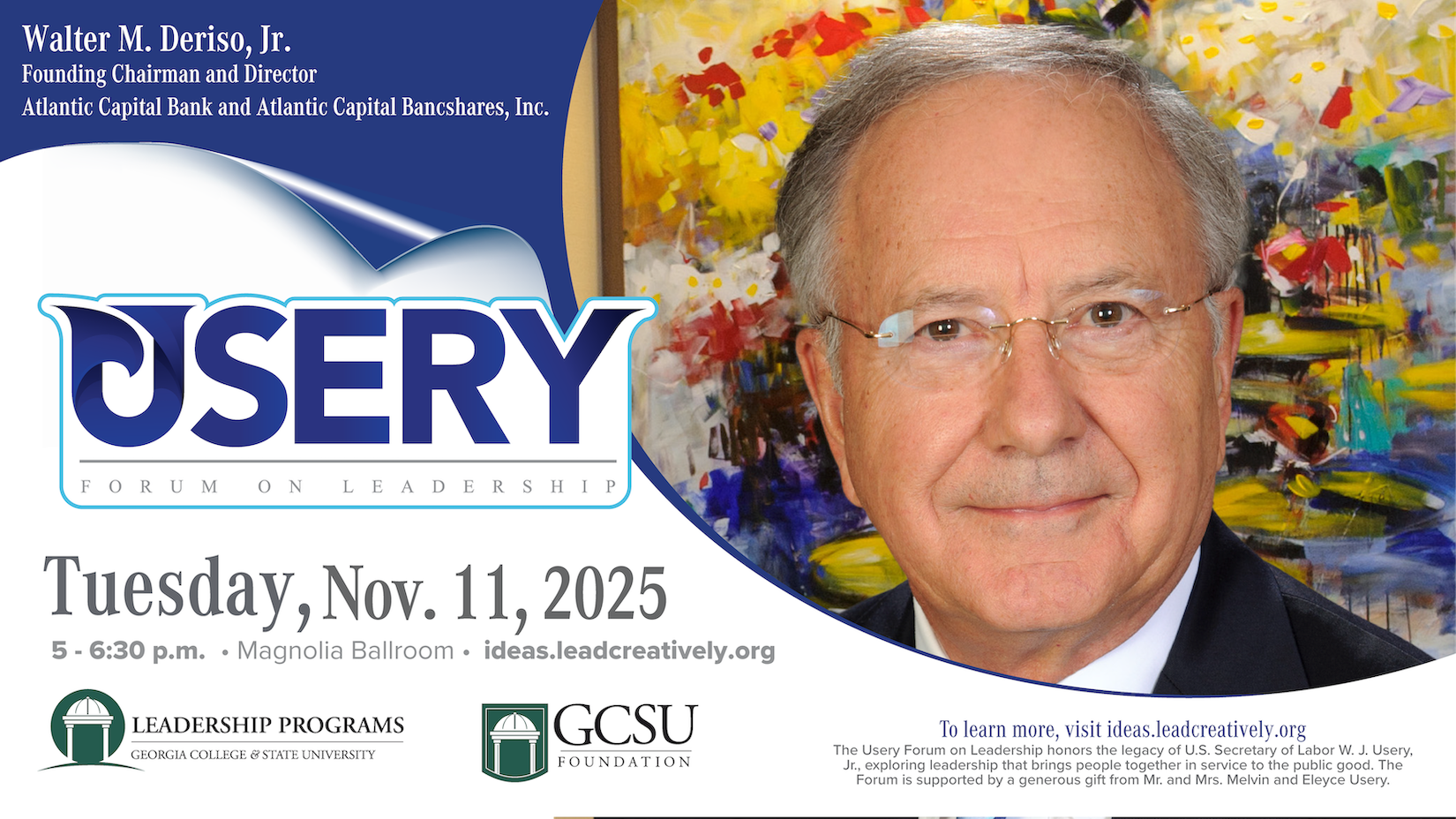 The Usery Forum on Leadership at Georgia College & State University will host Walter M. “Sonny” Deriso, Jr., founding chairman and director of Atlantic Capital Bank and Atlantic Capital Bancshares, Inc., on Tuesday, Nov. 11, 2025, from 5 to 6:30 p.m. in the Magnolia Ballroom on campus.