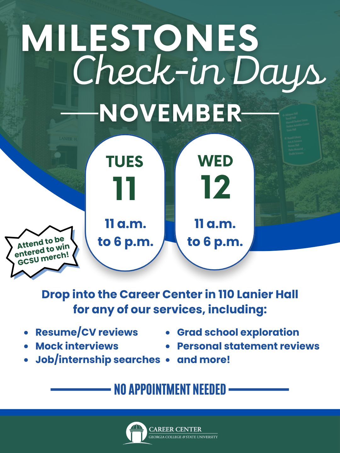 Stop by the Career Center in Lanier Hall 110 for drop-ins on Tuesday, Nov. 11, and Wednesday, Nov. 12, from 11 a.m. to 6 p.m. Our team is ready to meet with you — no appointment is needed.