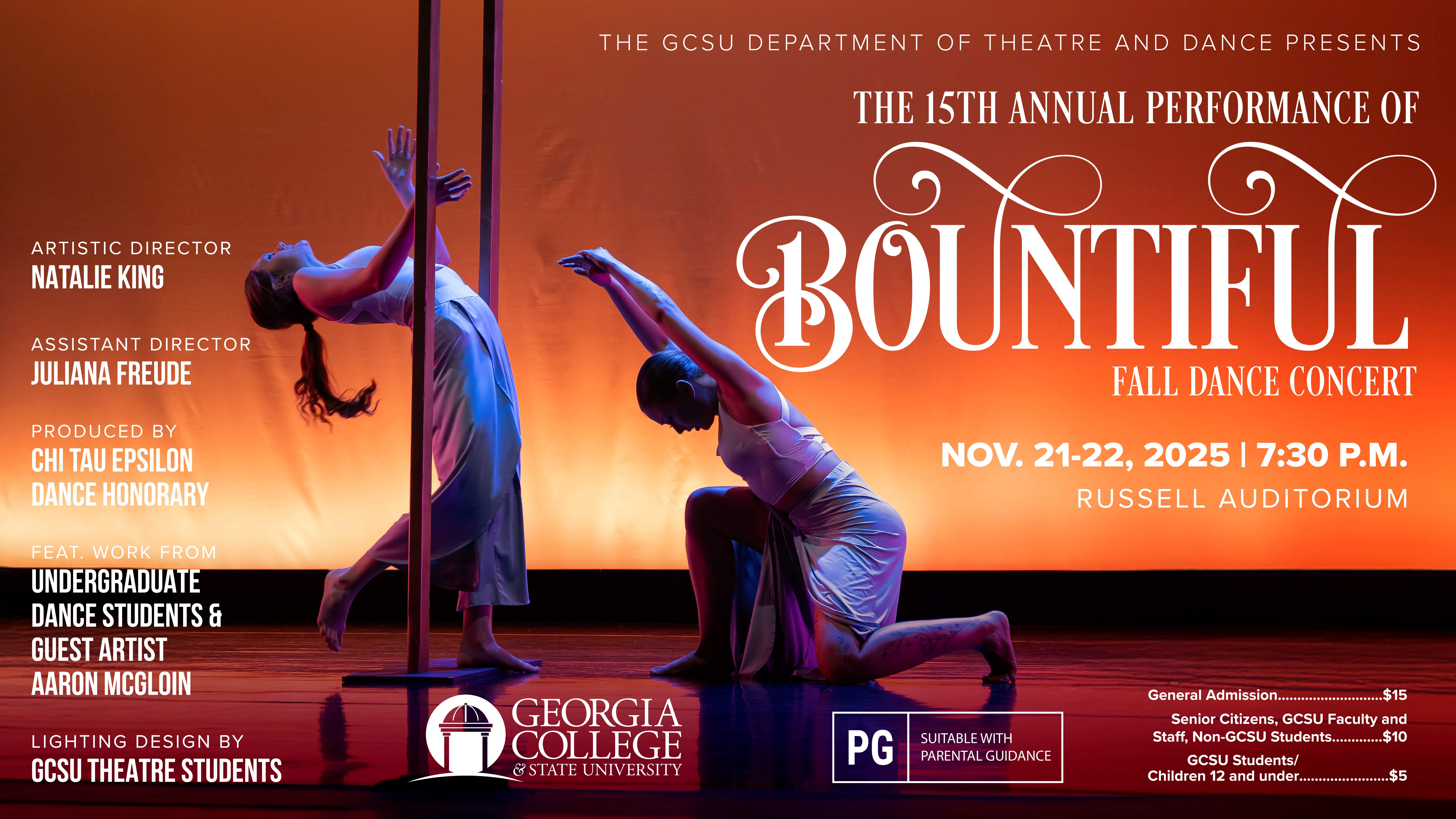 Join us for the 14th annual production of Bountiful Fall Dance Concert produced by Chi Tau Epsilon. The concert will feature a diverse repertoire of choreography that highlights both contemporary and classical dance forms featuring work from undergraduate dance students and Guest Artist Aaron McGloin. Lighting Design by GCSU Theatre students.