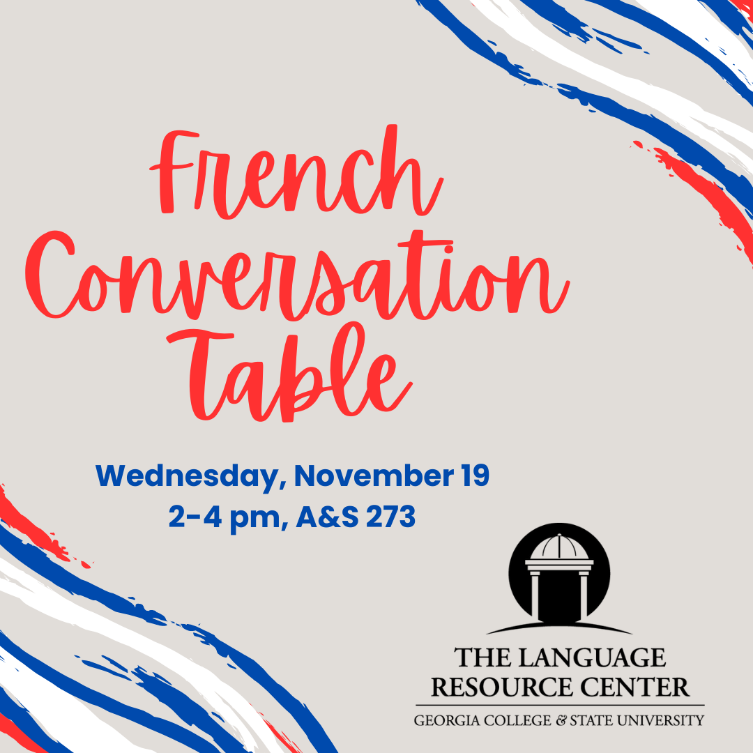 French Conversation Table returns to the Language Resource Center on Wednesday, Nov. 19. Drop by the LRC between 2 and 4 p.m. to practice your conversational skills in French. All levels are welcome, and support materials will be available for those who wish to use them. We hope to see you there!