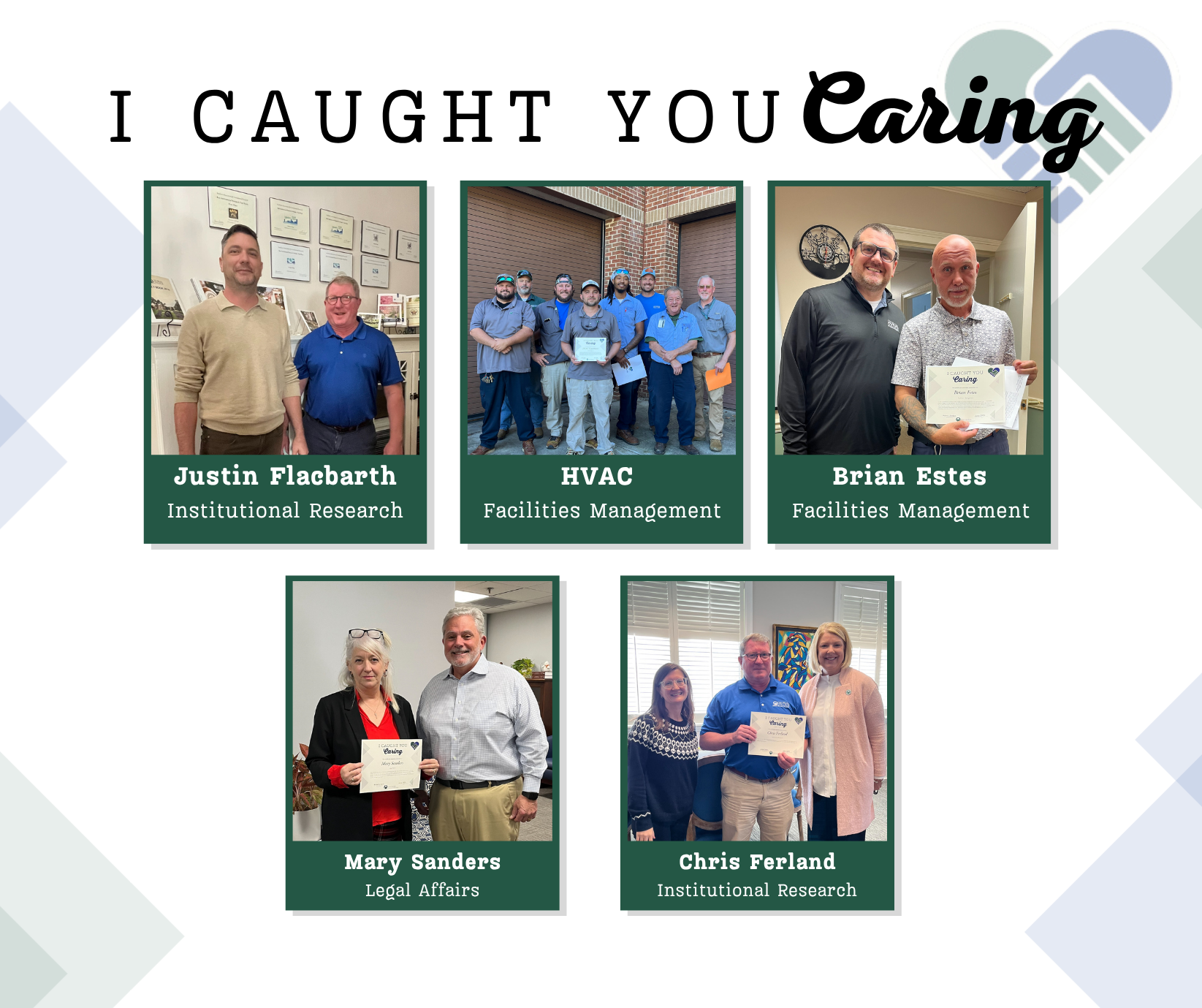 Congratulations to some of our recent recipients of I Caught You Caring: Mary Sanders, Brian Estes, Chris Ferland, Justin Flacbarthand our entire HVAC Team! Our staff members go above and beyond every day for Georgia College & State University, and this is illustrated by their nominations. Thank you for all you do.
