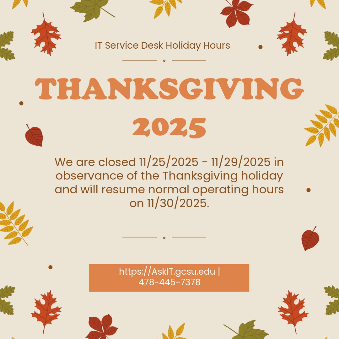 In observance of the Thanksgiving holiday, the IT Service Desk will be closed Thursday, Nov. 27, 2025, through Saturday, Nov. 29, 2025. The IT Service Desk will monitor phone and email messages to handle system emergencies while closed. A system emergency is defined as an entire building being offline; internet access to the campus not working; and/or Banner, PAWS, email, or the main web site being down. We will follow up on all non-emergency requests on Sunday, Nov. 30, 2025, during our regular hours of noon to 6 p.m. In the event of an emergency, please contact Public Safety at 478-445-4400.