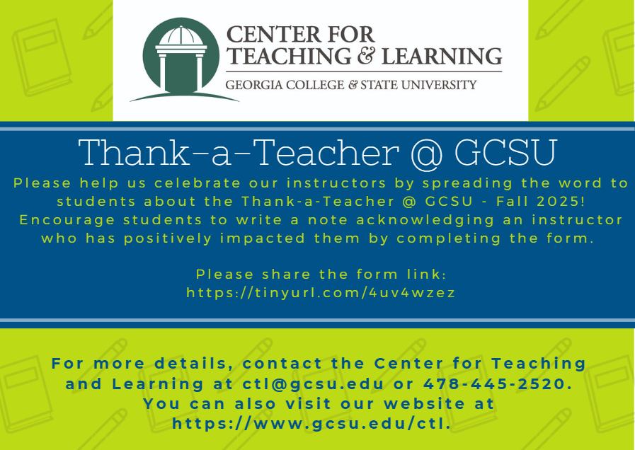 Please encourage students to follow this link to complete the Thank-a-Teacher form: https://gcsu.co1.qualtrics.com/jfe/form/SV_bI70lh5af2IeTVs. They can also watch a short Thank-a-Teacher @ GCSU promotional video.