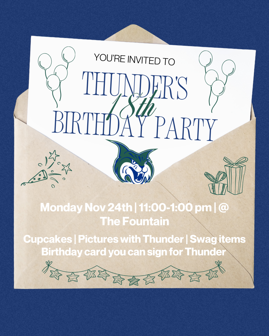 Come out to the fountain to celebrate Thunder's 18th birthday! Enjoy cupcakes, pictures with Thunder, swag items and sign a birthday card for Thunder.