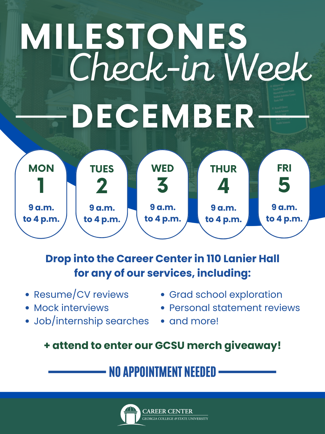 Whether you're job searching, applying to grad school or just need some career advice — we’ve got you covered! Stop by the Career Center in 110 Lanier Hall this week, Dec. 1 through 5, from 9 a.m. until 4 p.m. for help with resumes, applications, Career Planning Milestones and more — no appointment needed!