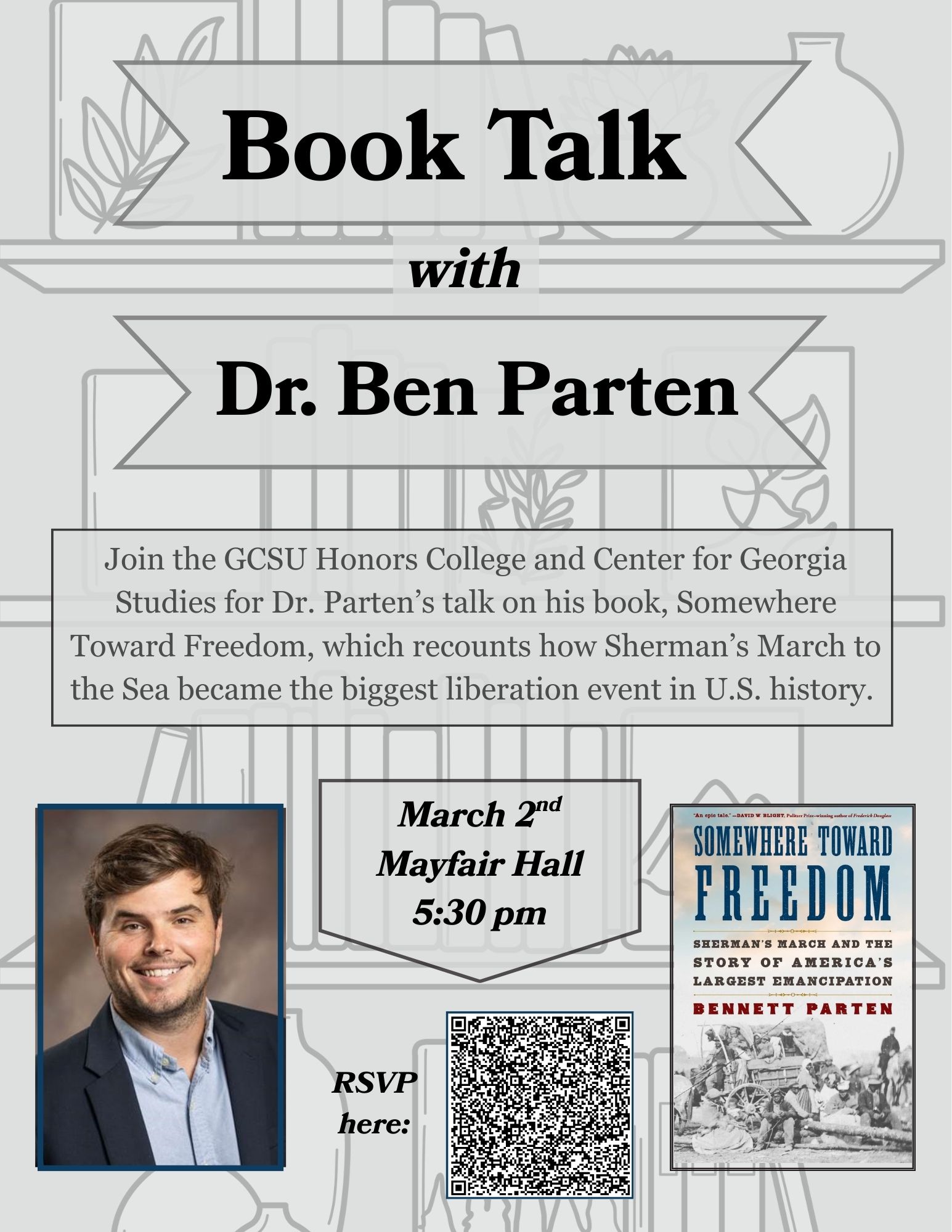 A groundbreaking account of Sherman’s March to the Sea — the critical Civil War campaign that destroyed the Confederacy — told for the first time from the perspective of the tens of thousands of enslaved people who fled to the Union lines and transformed Sherman’s march into the biggest liberation event in American history. Dr. Bennett Parten, assistant professor of History at Georgia Southern University, will discuss his new book "Somewhere Toward Freedom," which Simon & Schuster has recently released.
