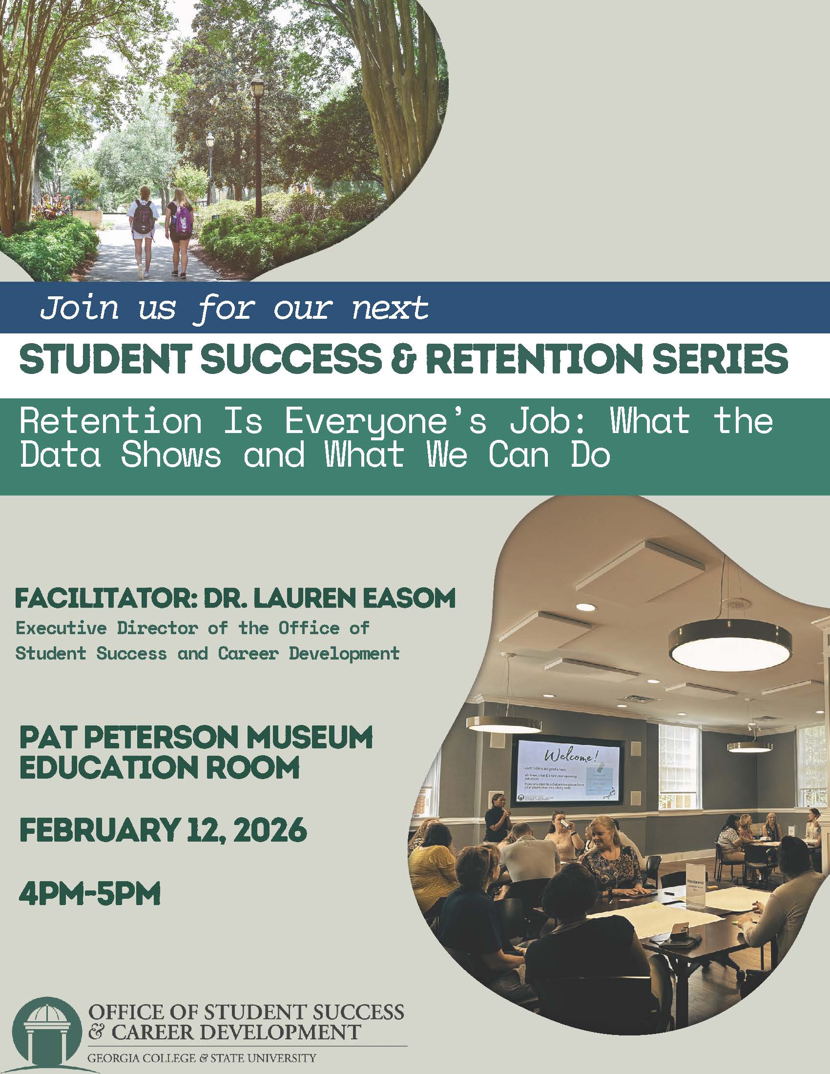 The Office of Student Success & Career Development invites you to attend the next session in our Student Success & Retention Series, Retention Is Everyone’s Job: What the Data Shows and What We Can Do on Thursday, Feb. 12, 2026, from 4 p.m. to 5 p.m. in the Pat Peterson Museum Education Room.
