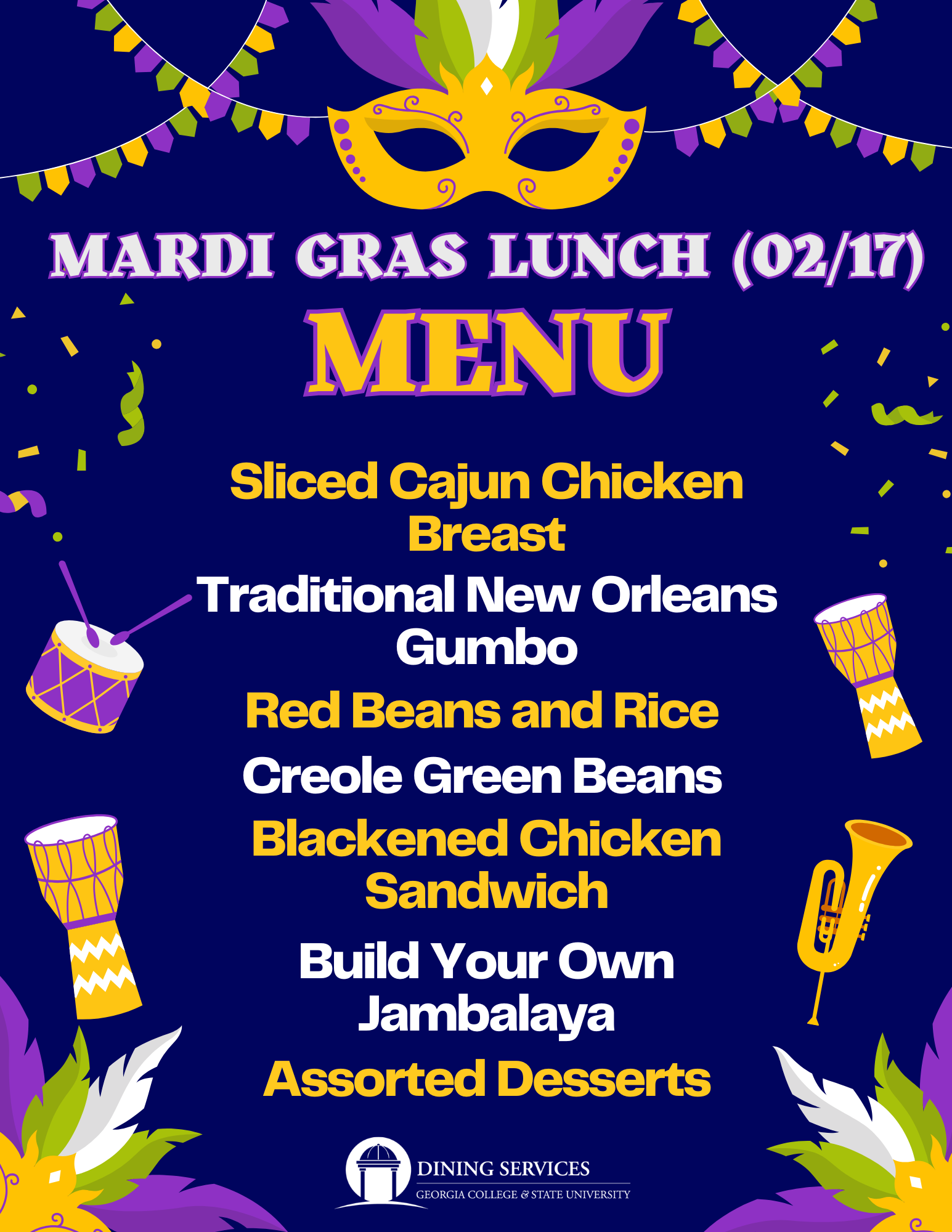 Join us for a Mardi Gras lunch featuring Cajun chicken, New Orleans gumbo, red beans & rice, Creole green beans, blackened chicken sandwiches and a build-your-own jambalaya bar. Grab your beads and bring your appetite!