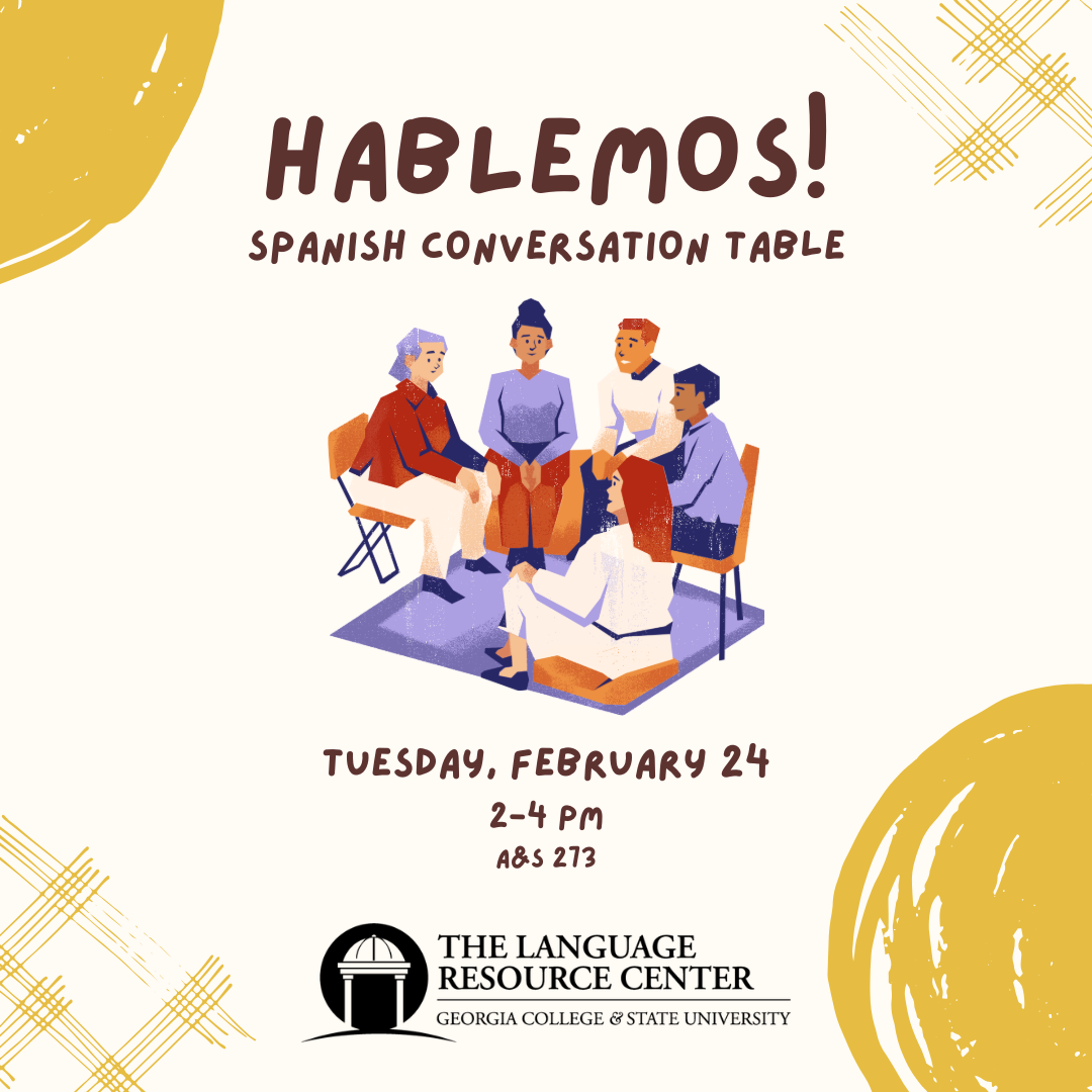 The Georgia College & State University campus community is invited to stop by the Language Resource Center on Feb. 24, for Spanish Conversation Table. This drop-in event will be held from 2 p.m. to 4 p.m. for anyone who wants to practice their spoken Spanish. Support materials will be provided so that speakers of all levels have the opportunity to work on their spoken Spanish skills. We hope you can join us.
