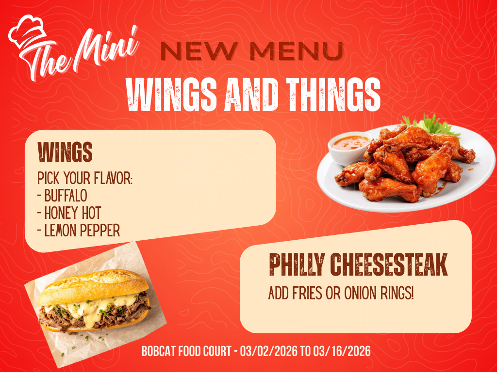 Loaded spuds had their moment … now it’s time for saucy wings and stacked Philly cheesesteaks. Pull up to The Mini in the Bobcat Food Court and order yours today!