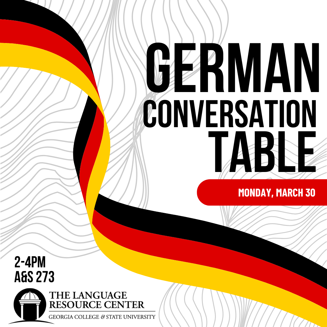 German Conversation Table is back on Monday, March 30. Stop by the Language Resource Center any time between 2 and 4 p.m. and practice your German speaking skills. Conversation Table provides a laidback way for anyone in the Georgia College & State University community (students, faculty or staff) who is interested in the German language to have a little fun using the language. Support materials will be available to those who need or want them, but open conversation is welcome too.
