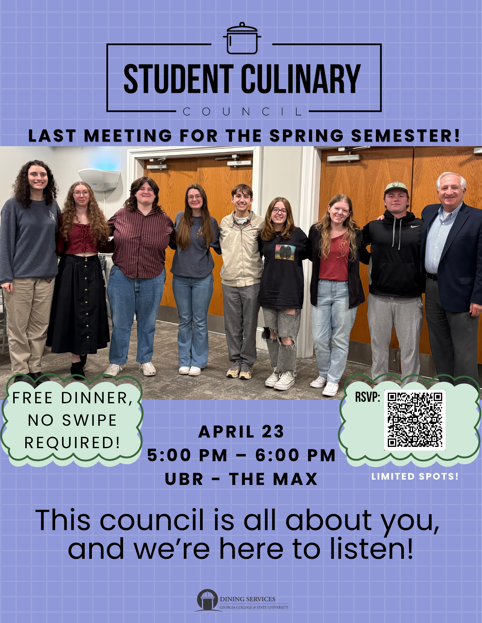 Talk. Eat. Share. Students are invited to register for our monthly Student Culinary Council meeting at The MAX, held every last Thursday of the month. This month's meeting will be held on April 23 at 5 p.m.