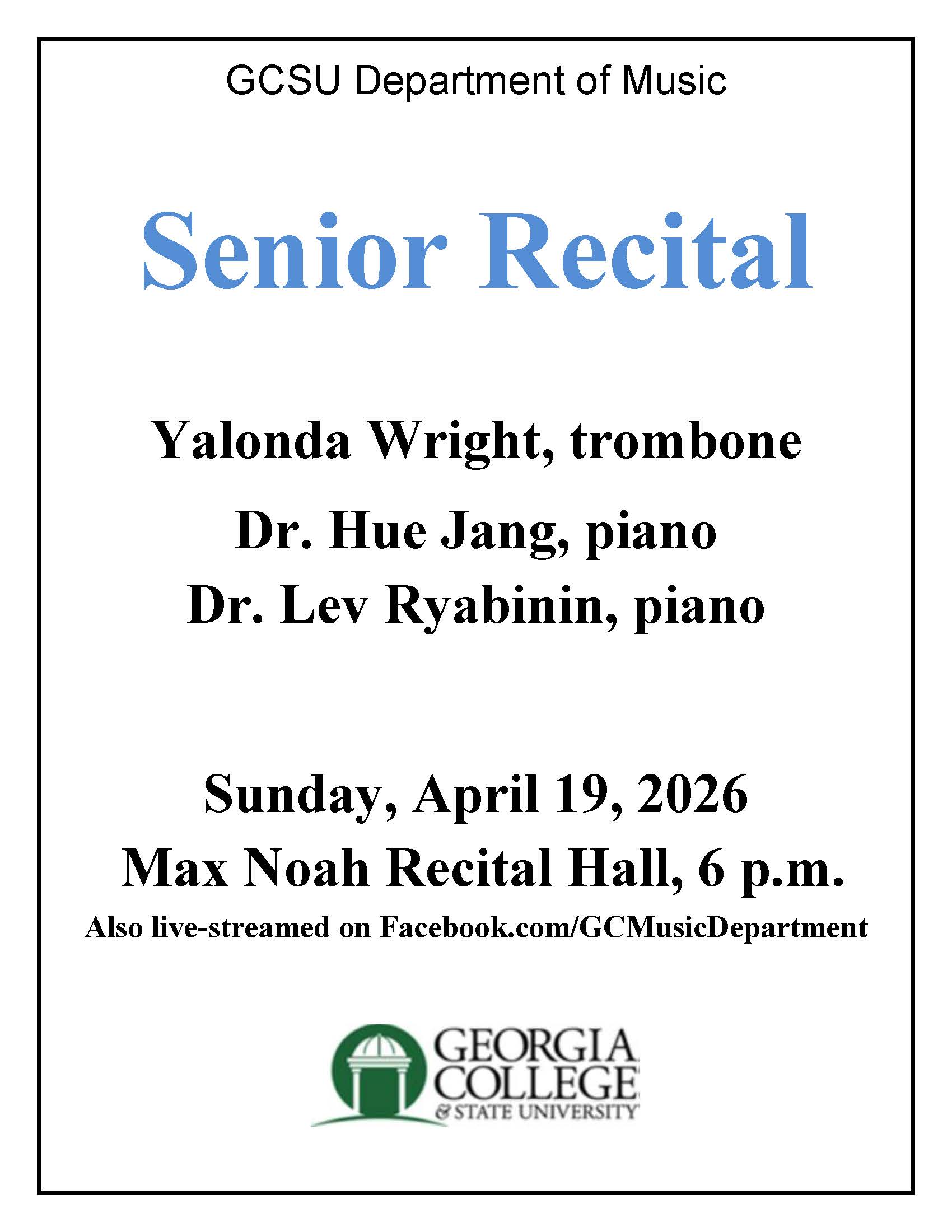 Yalonda Wright, trombone, presents her Senior Recital with Dr. Hue Jang and Dr. Lev Ryabinin, pianists, on Sunday, April 19, at 6 p.m. in Max Noah Recital Hall or on facebook.com/GCMusicDepartment.