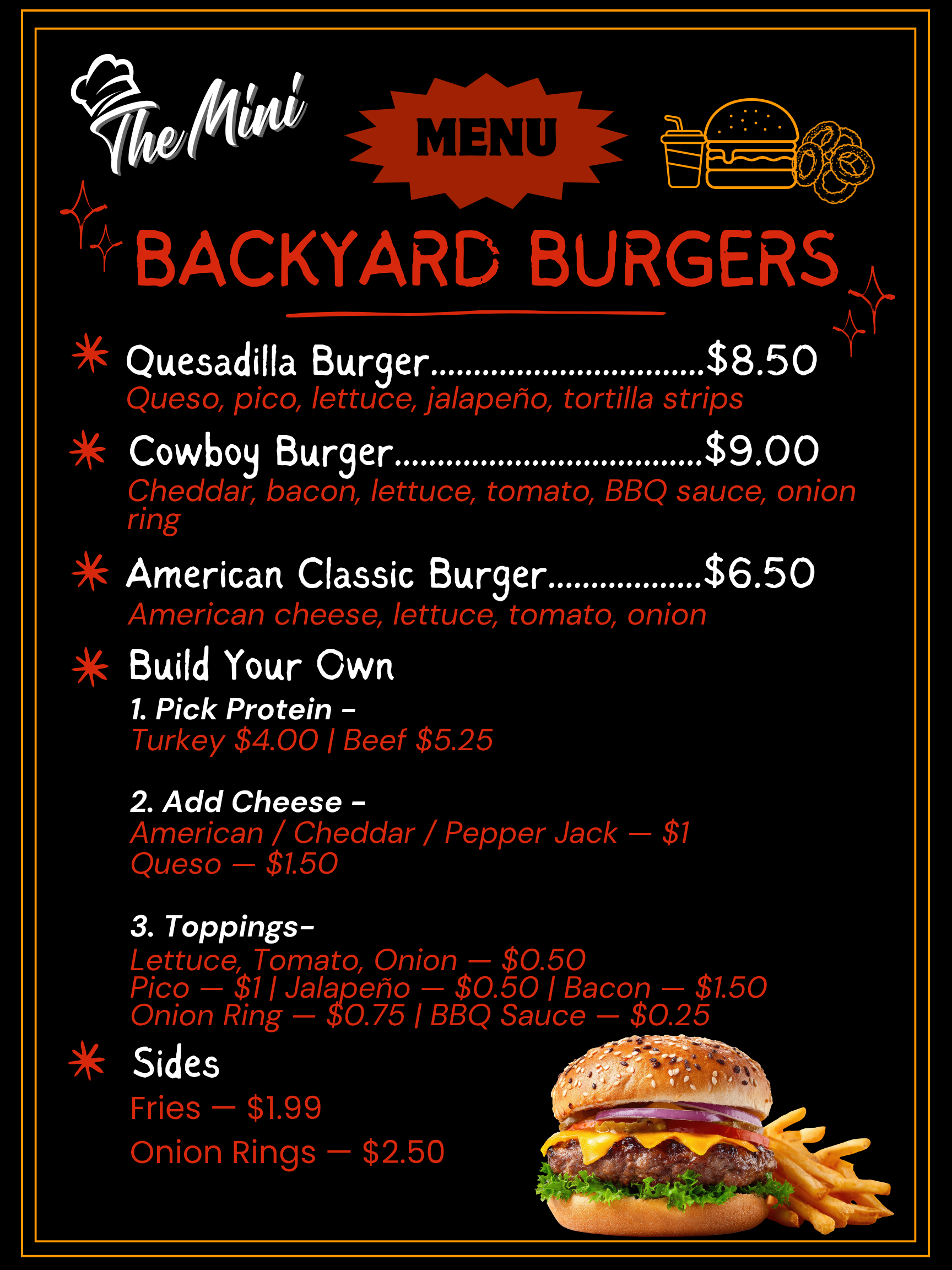 Our sizzling new menu rotation is here - backyard burgers! Try our signature burgers or build your own - Fresh flavors, bold bites, and backyard vibes you won’t want to miss. Grab yours today from The Mini!