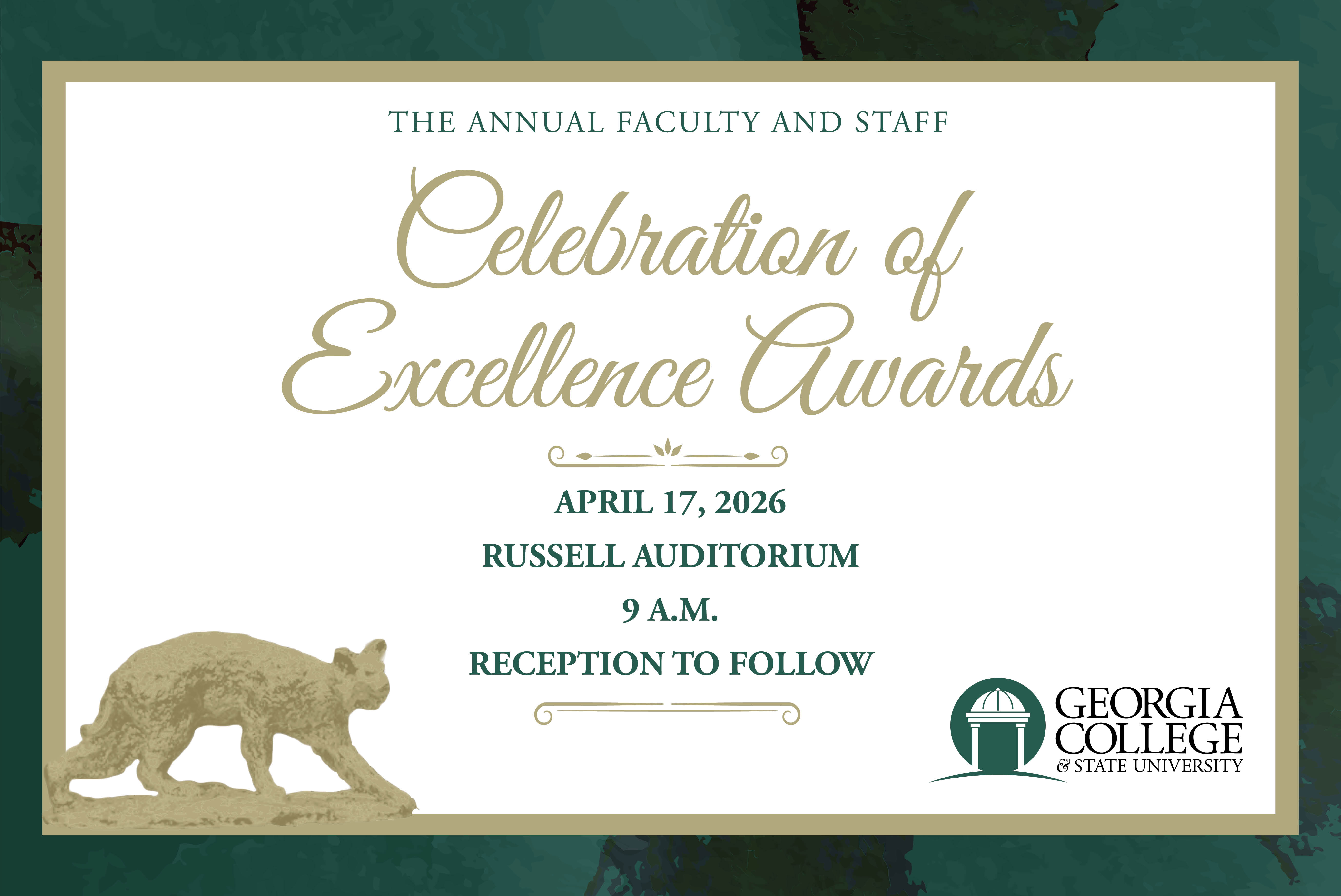 The Georgia College & State University Celebration of Excellence allows the university community to acknowledge the excellent work of faculty and staff in a combined ceremony. We honor those who have shown excellence in service, leadership, teaching, and scholarship. The ceremony currently includes 19 total awards, with 17 Bobcat statues awarded.