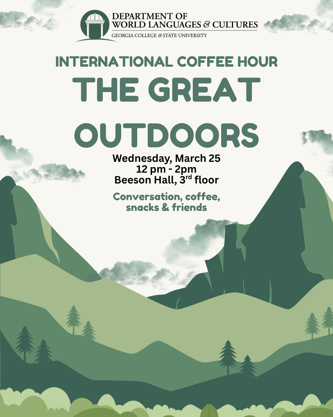 The Department of World Languages & Cultures invites members of the campus community to join us for International Coffee Hour on Wednesday, March 25 from 12 p.m. to 2 p.m. This month's theme is The Great Outdoors and will feature conversations on how you like to spend time outside as well as an exploration of some beautiful, natural wonders around the world. Support materials will be provided to aid in conversations in English, French, German, Italian and Spanish. Snacks and drinks...
