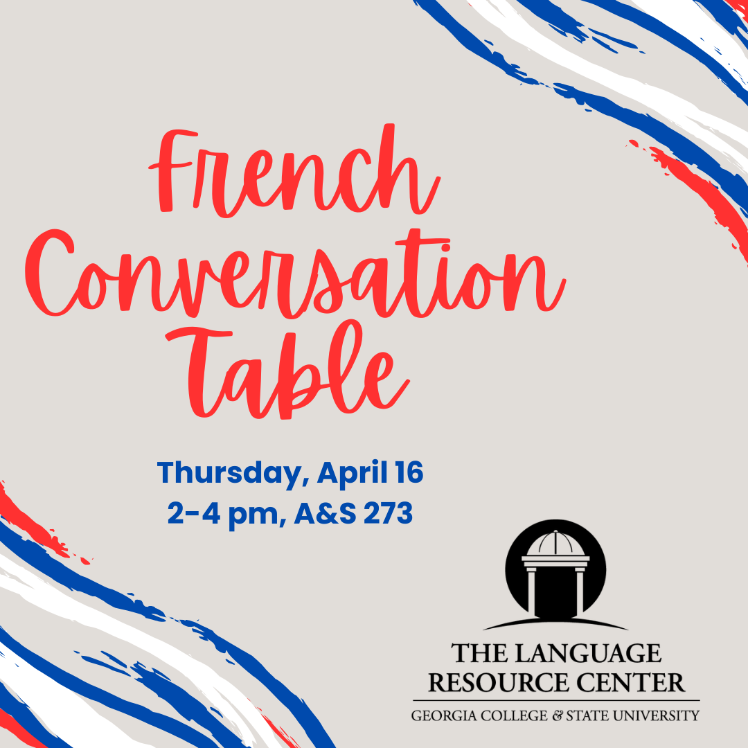 French Conversation Table returns to the Language Resource Center on Thursday, April 16. Drop by the LRC between 2 and 4 p.m. to practice your conversational skills in French. All levels are welcome, and support materials will be available for those who wish to use them. We hope to see you there!