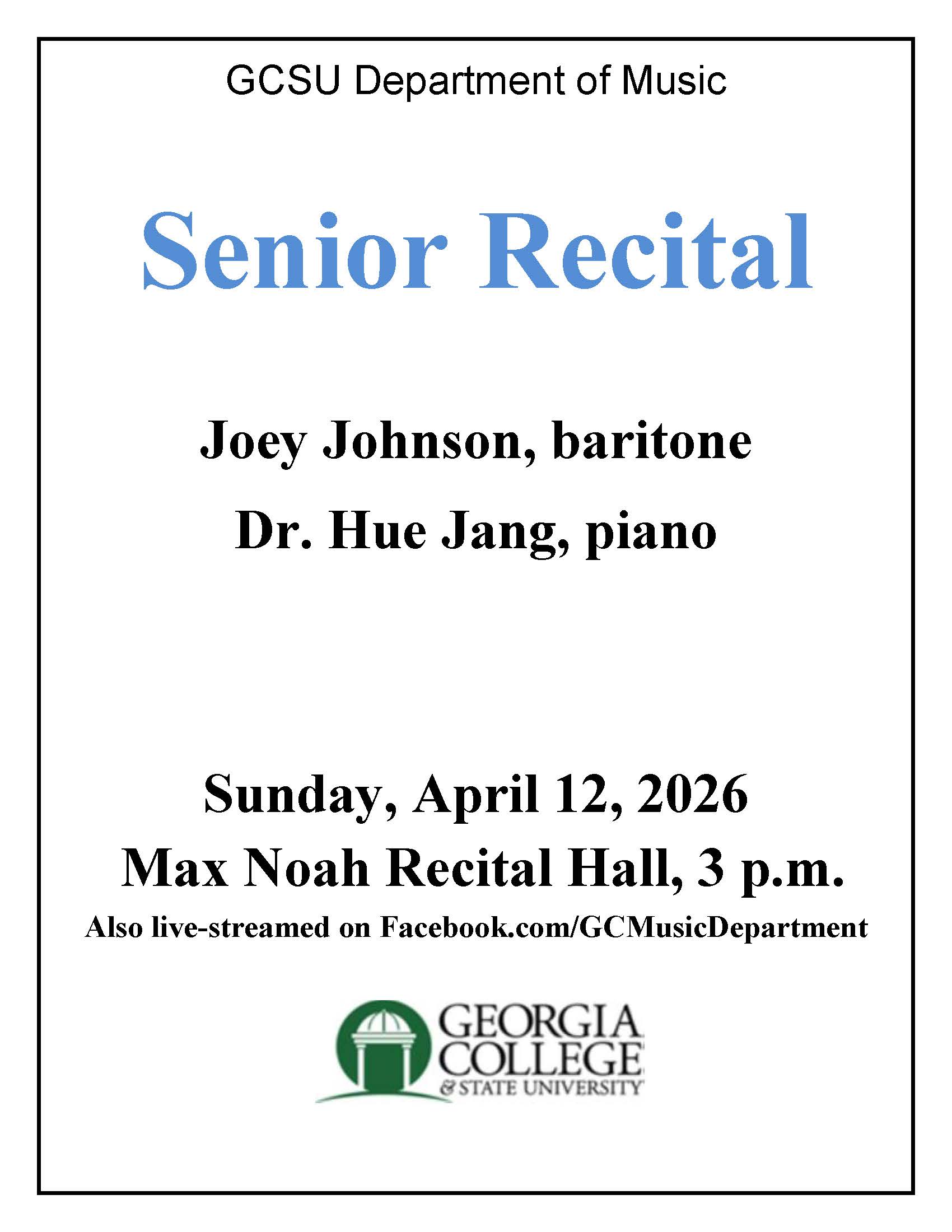 Senior Recital: Joey Johnson, baritoneDr. Hue Jang, pianoSunday, April 12, 3 p.m.Max Noah Recital Hall and also live streamed on facebook.com/GCMusicDepartment