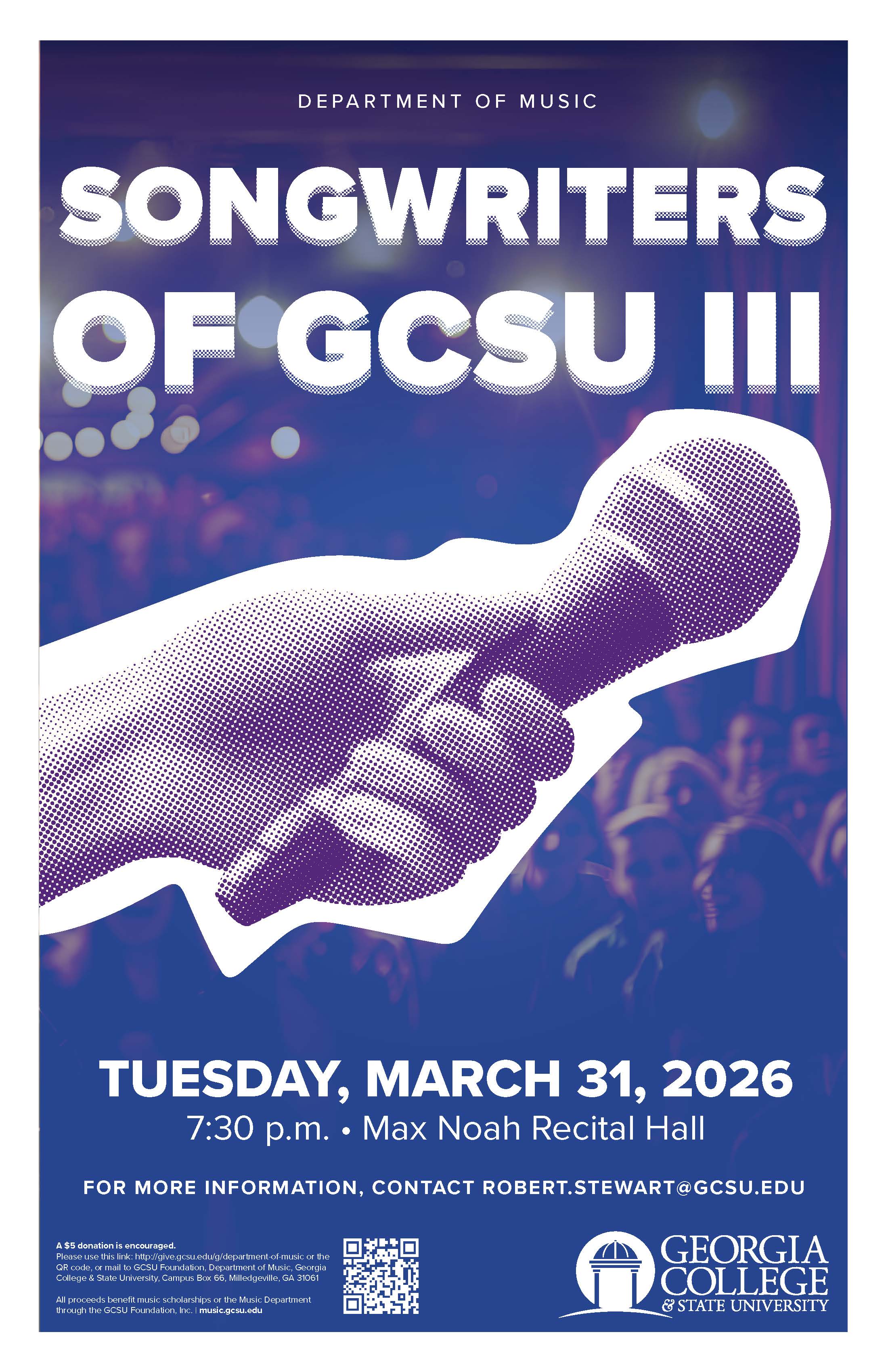 On Tuesday, March 31, at 7:30 p.m., Songwriters of Georgia College & State University III, coordinated by Dr. Robert Stewart, will feature GCSU students performing songs and instrumental pieces written by themselves. Performers include Nate McIntyre, Michelle, Hyppolite, Olivia Mufalli, Lilly Kevers, Emma Kevers, Jada Danforth, Janice Fallin, Julianna Valcheff and Jim McKinney. A $5 donation is encouraged. Online donations can be made at give.gcsu.edu/g/department-of-music/. All proceeds...