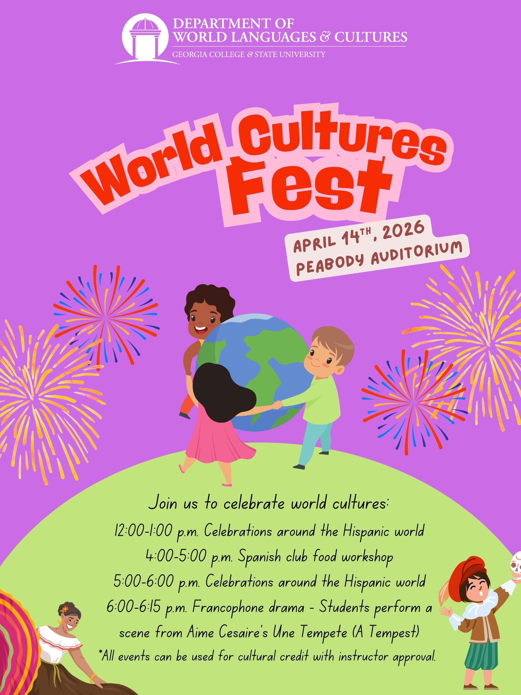 The Department of World Languages & Cultures invites you to stop by Peabody Auditorium on Tuesday, April 14, for World Cultures Fest. Students from Dr. Diaz-Gomez's and Dr. Castillo Scott's SPAN 1002 classes, Dr. Fraunhofer's Francophone Drama class and the Georgia College & State University Spanish Club will offer an exciting variety of cultural presentations throughout the day. The schedule includes:12 - 1 p.m.: SPAN 1002 poster presentations of various celebrations in 16 Hispanic...
