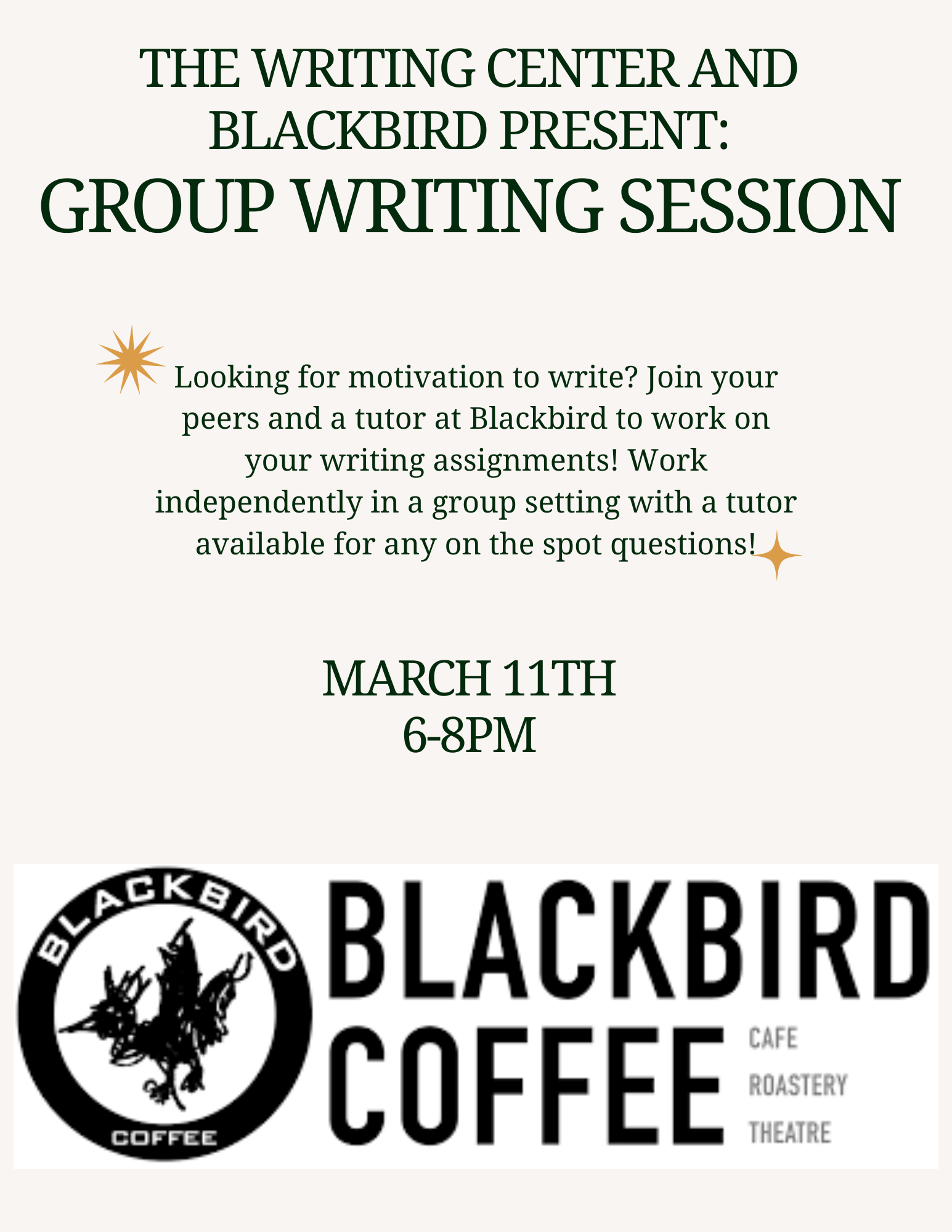 Are you looking for motivation to write? Join your peers and Writing Center tutors at Blackbird on March 11 to work on your writing assignments! Work independently in a group setting. Tutors will be available for any on the spot questions.