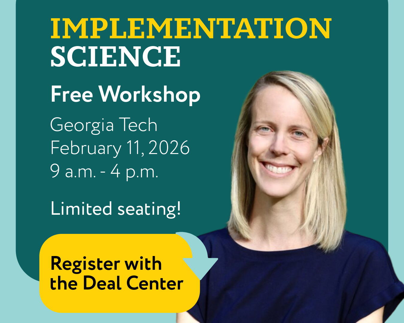 Implementation science helps us bridge the gap between research and real-world application, making it a key element of instituting systemic change. The Deal Center still has seats available at our free Implementation Science workshop, "The Science of Implementation: Examining the Application of Strategy." We'll be hosting Dr. Katherine Pickard, Emory University School of Medicine Associate Professor, at the Georgia Institute of Technology on February 11th, 2026 from 9 a.m. to 4 p.m...