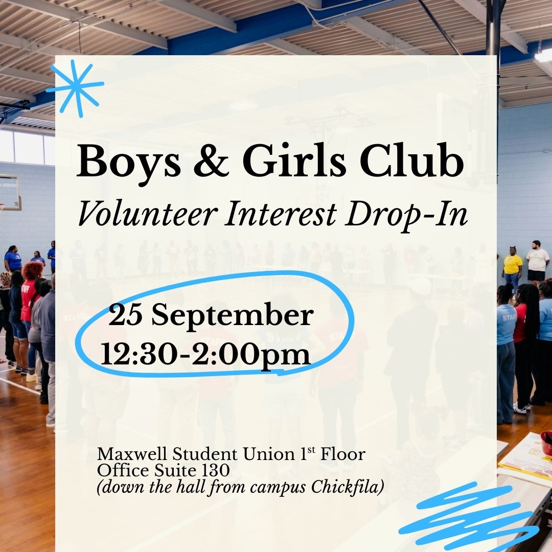 Are you interested in volunteering with the Boys and Girls Club? Do you want to learn more about what type of volunteer opportunities are available through the organization? Drop in to learn more, meet the volunteer coordinator and grab a snack!Date: Thursday, Sept. 25Time: Drop in 12:30 p.m. - 2 p.m.Location: Maxwell Student Union Conference Room 130 (Down the hall from campus Chick-fil-A.)